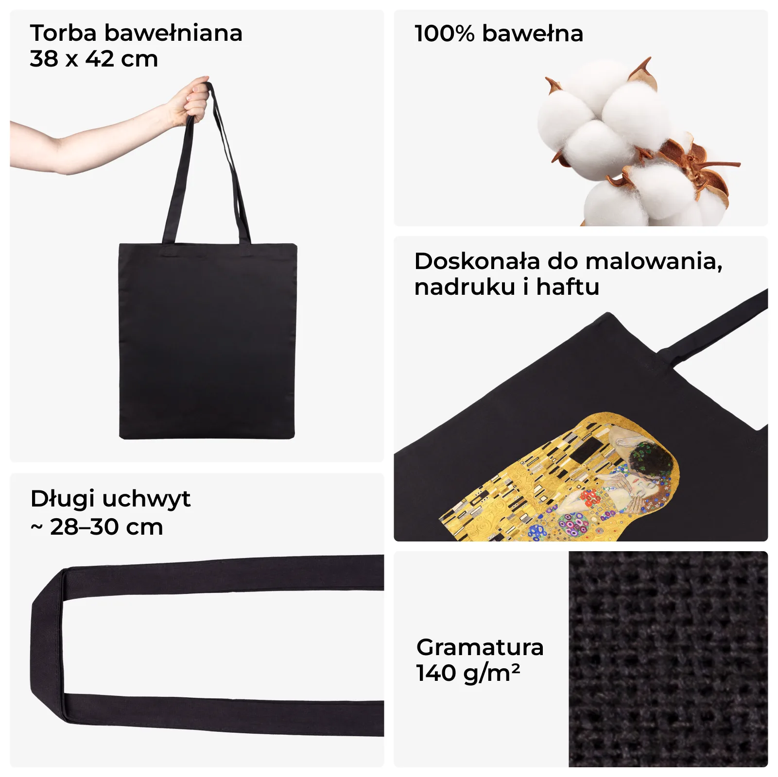 Czarna bawełniana torba 38 x 42 cm to praktyczny i uniwersalny model na co dzień. Neutralny kolor i prosty krój sprawiają, że pasuje do różnych stylizacji i zastosowań - od zakupów, przez noszenie laptopa, aż po codzienne obowiązki. Jest trwała, pojemna i stanowi wygodną, ekologiczną alternatywę dla jednorazowych toreb.