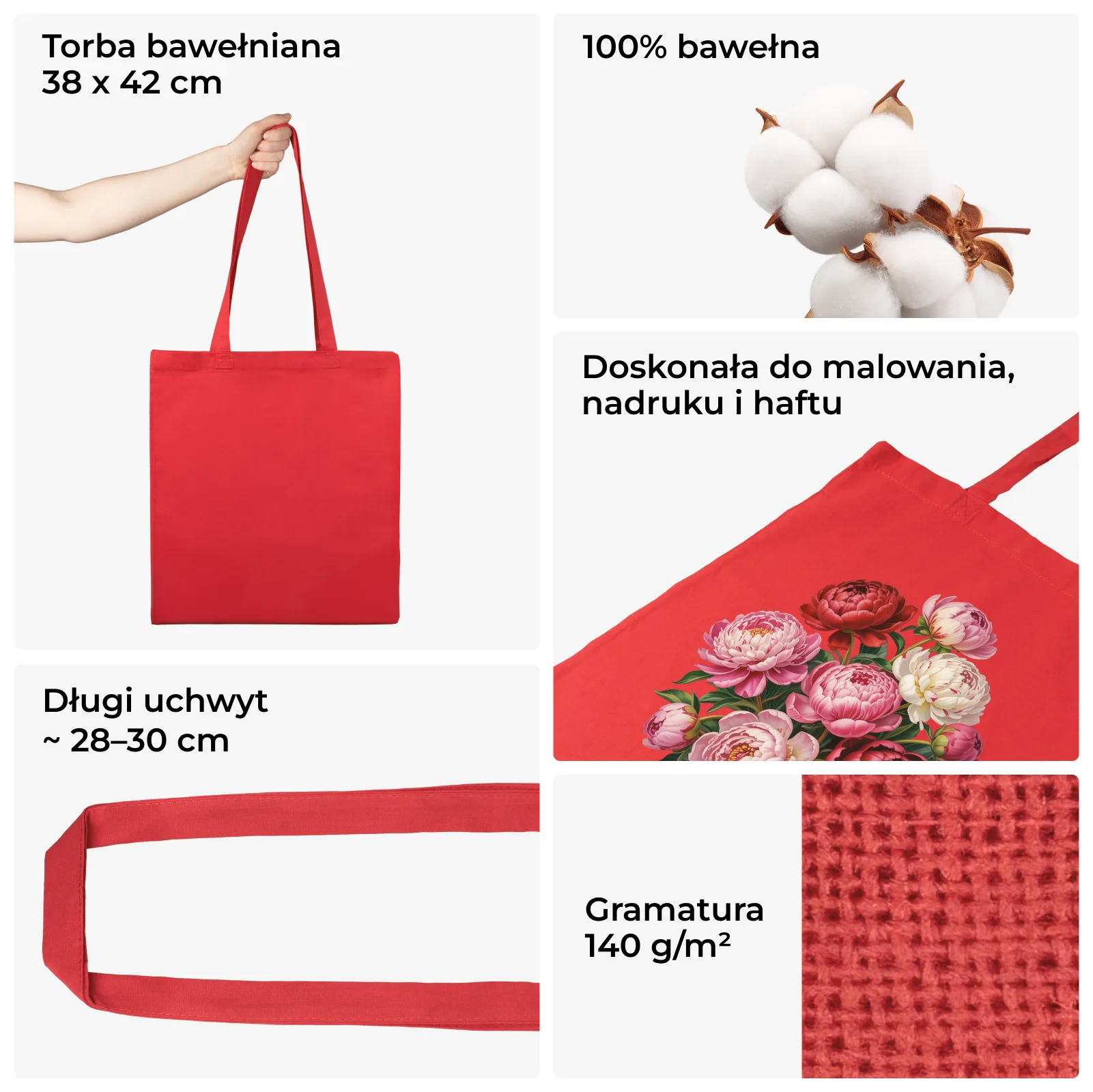 Chcesz, aby Twoja kampania reklamowa lub firmowy gadżet naprawdę zostały zauważone? Czerwień to kolor, który gwarantuje uwagę. Wykorzystaj jej moc i stwórz projekt, który zapadnie w pamięć. Torba bawełniana z nadrukiem na czerwonym tle to doskonały wybór dla dynamicznych marek, organizacji pozarządowych i wszystkich, którzy mają coś ważnego do zakomunikowania.
