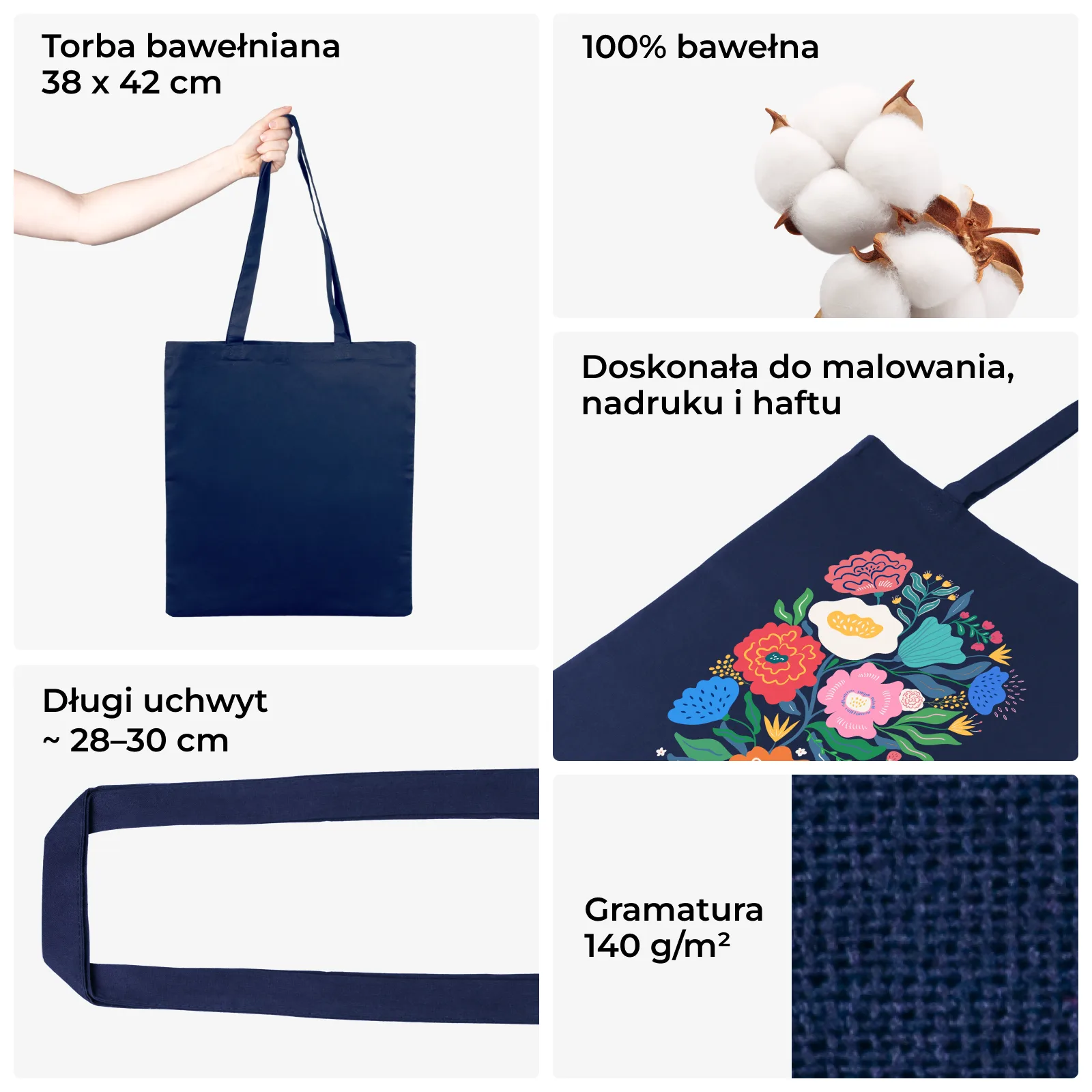 1 szt. Torba bawełniana 38 x 42 cm z długimi uchwytami - granatowa