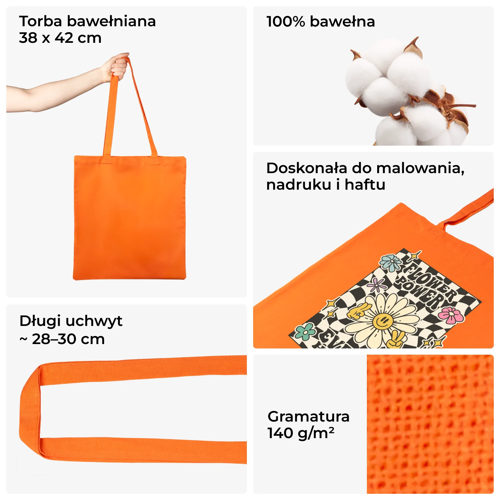Nasza torba bawełniana o wymiarach 38 x 42 cm z długimi uchwytami w kolorze pomarańczowym to idealne rozwiązanie zarówno dla klientów indywidualnych, jak i biznesowych. Poniżej znajdziesz szczegółowy opis techniczny oraz specyfikacje produktu.