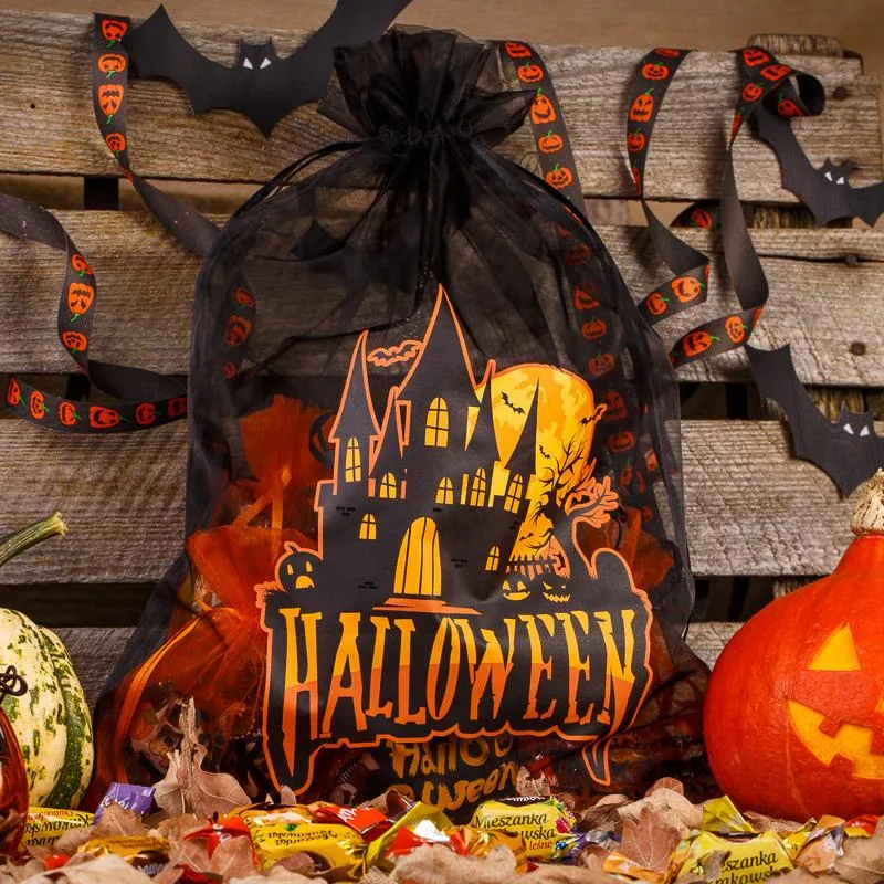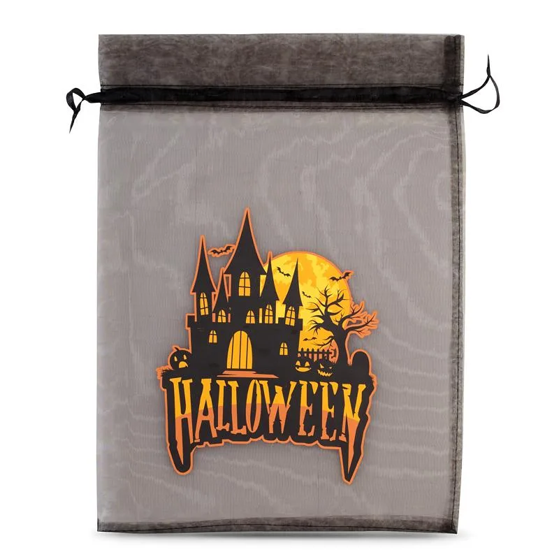 Prezentujemy duży woreczek uszyty z organzy, w rozmiarze 40 x 55 cm oraz kolorze czarnym. Nasza torebka posiada atrakcyjny tematyczny nadruk, nawiązujący do święta duchów.