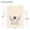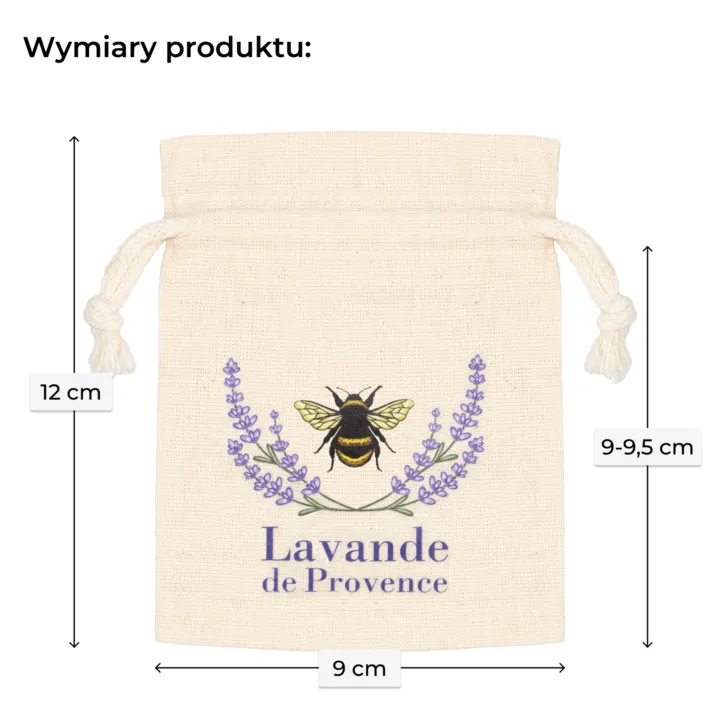 W zestawie znajdziesz 10 sztuk woreczków bawełnianych 9 x 12 cm w kolorze naturalnym, z ozdobnym kołnierzem nad ściągaczem i podwójnym, plecionym sznurkiem. Front zdobi grafika z pszczołą i gałązkami lawendy z napisem "Lavande de Provence".