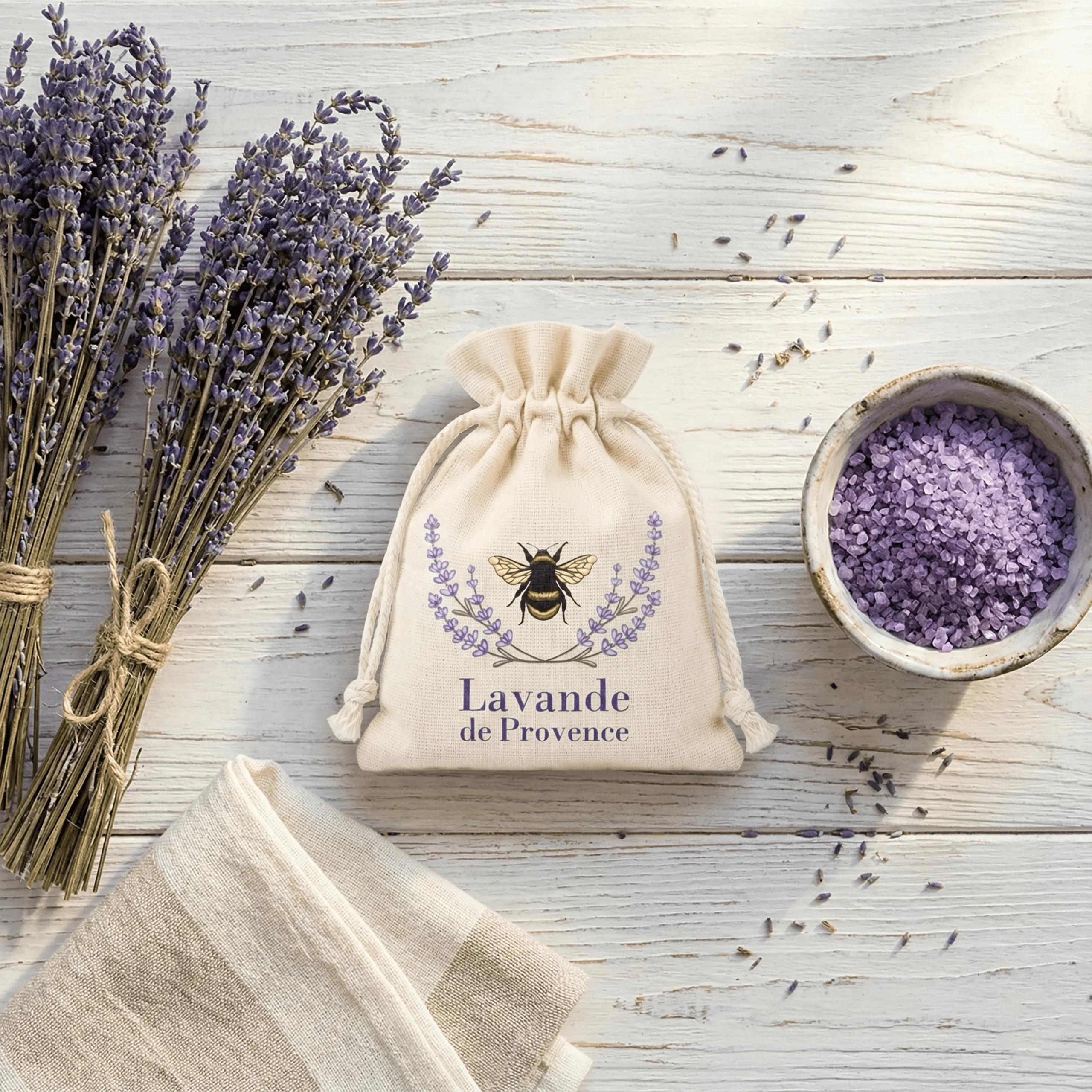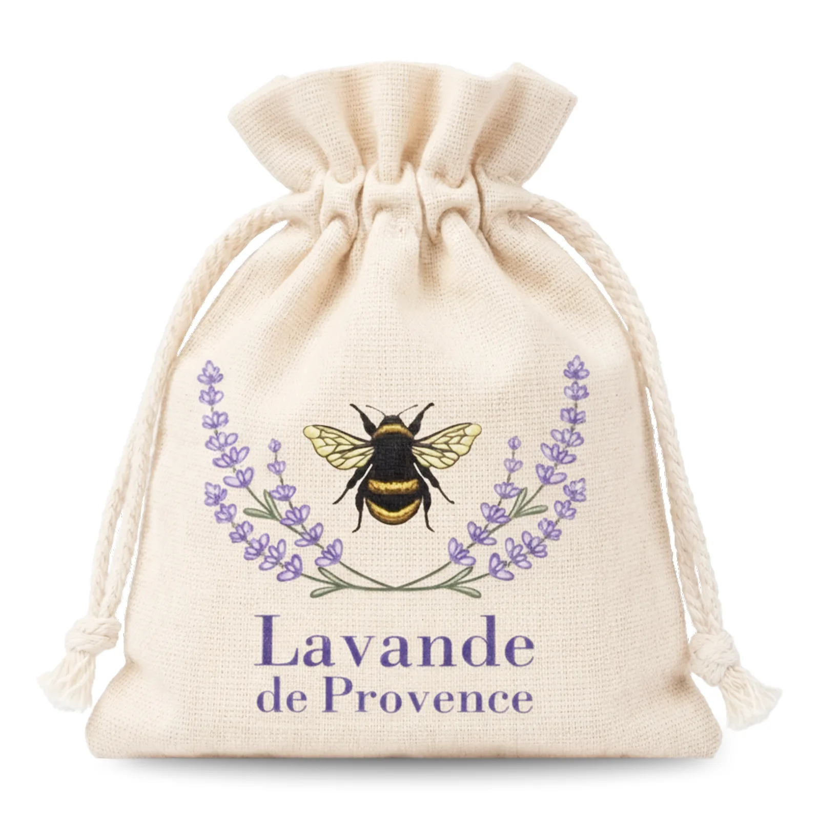 W zestawie znajdziesz 10 sztuk woreczków bawełnianych 9 x 12 cm w kolorze naturalnym, z ozdobnym kołnierzem nad ściągaczem i podwójnym, plecionym sznurkiem. Front zdobi grafika z pszczołą i gałązkami lawendy z napisem "Lavande de Provence".