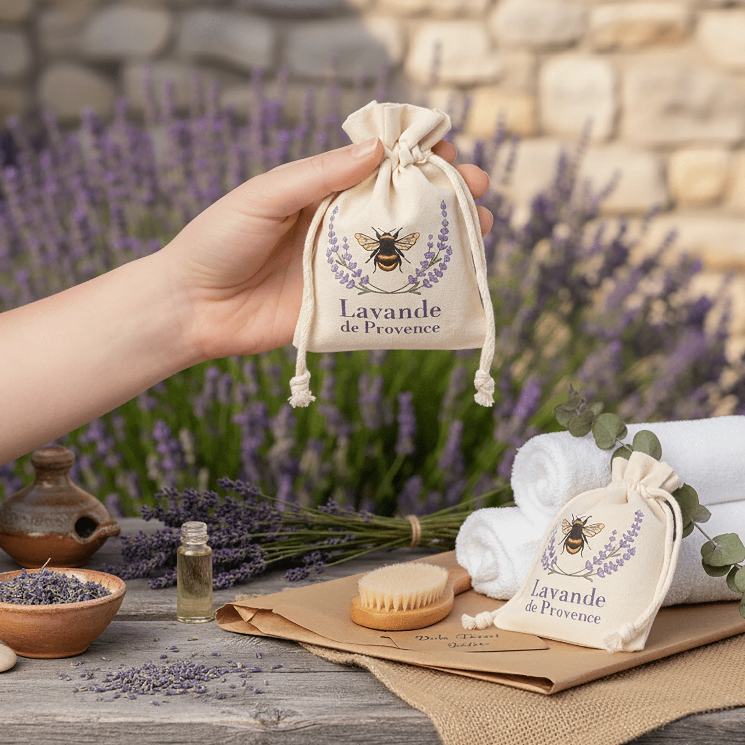 Naturalne bawełniane woreczki Lavande de Provence 9 x 12 cm są chętnie wybierane przez plantacje lawendy, producentów kosmetyków i marki tworzące lawendowe zestawy prezentowe. Gładka powierzchnia bawełny umożliwia dodanie nadruku logo lub prostej grafiki, dzięki czemu opakowanie wspiera identyfikację wizualną Twojej marki.