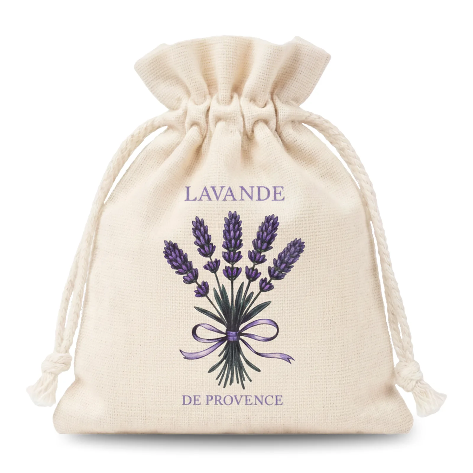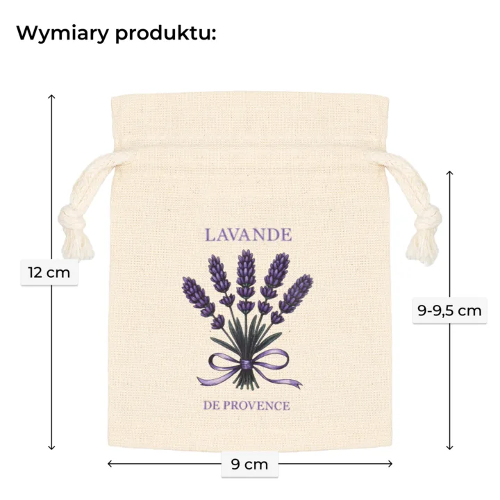 Woreczki uszyte są z tkaniny ze 100% bawełny w naturalnym kolorze. Bawełna ma przyjemną, lekko surową fakturę, dobrze przepuszcza powietrze i nadaje opakowaniu charakter woreczków bawełnianych rustykalnych. Neutralny odcień stanowi stylowe tło dla fioletowego nadruku z bukietem lawendy przewiązanym wstążką.