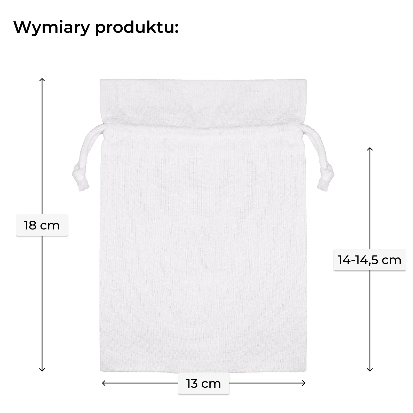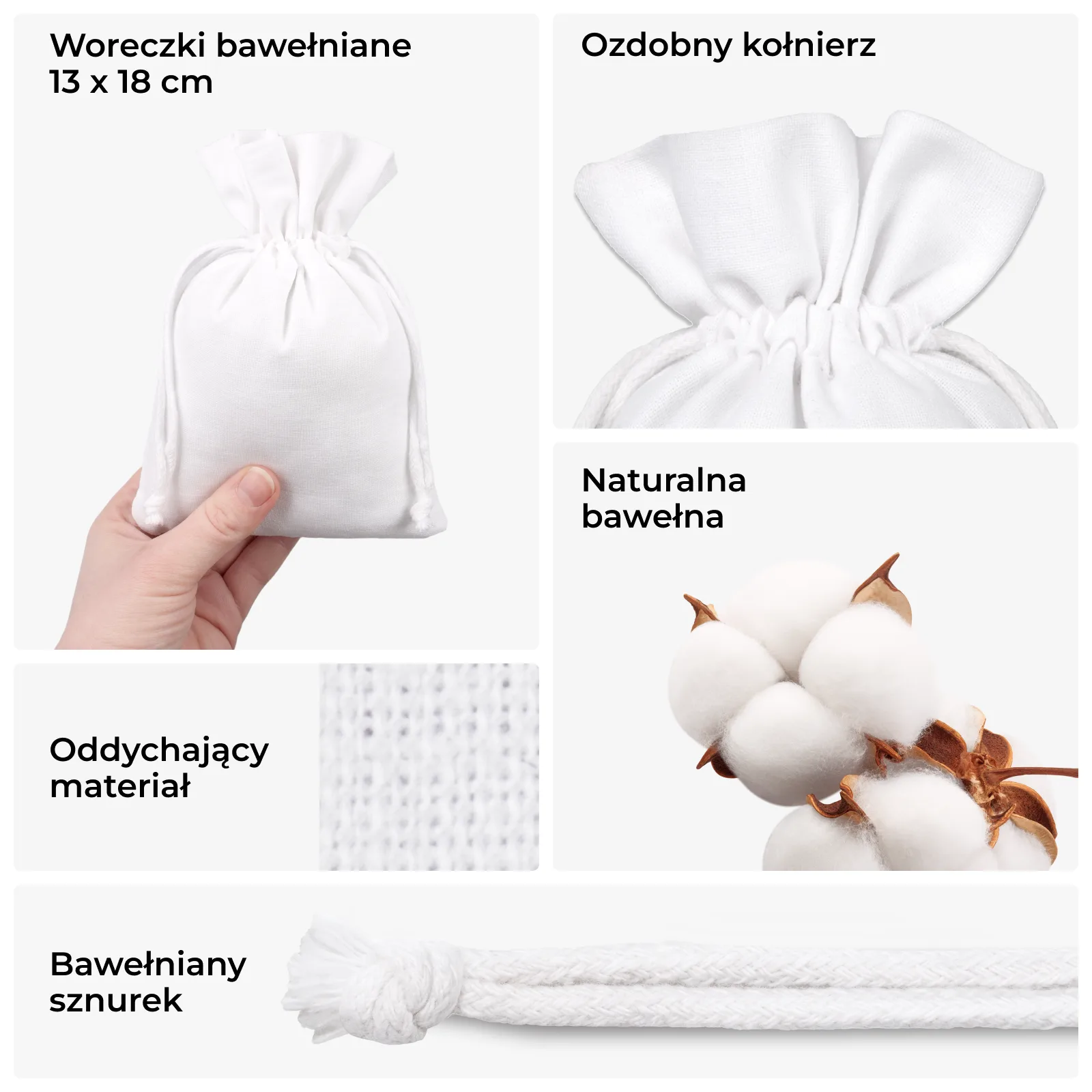 Zbiór 10 sztuk woreczków z oryginalnego materiału typu bawełna w rozmiarze 13 x 18 cm, których biały kolor świetnie sprawdzi się w niemal każdej sytuacji. Oferowany przez nas zestaw jest uniwersalny, bowiem pozwala na wykorzystanie woreczków na wiele sposobów - w zależności od sytuacji.