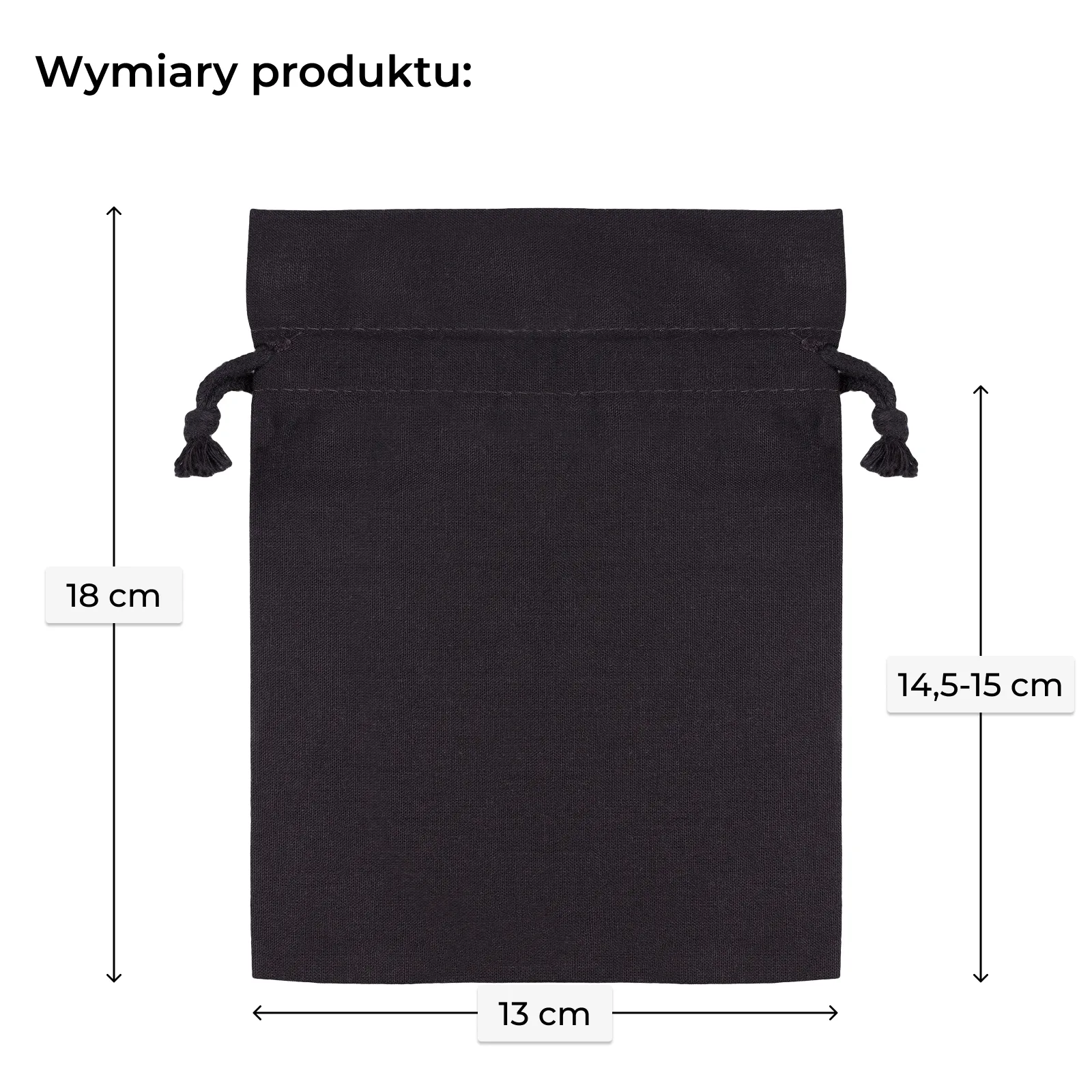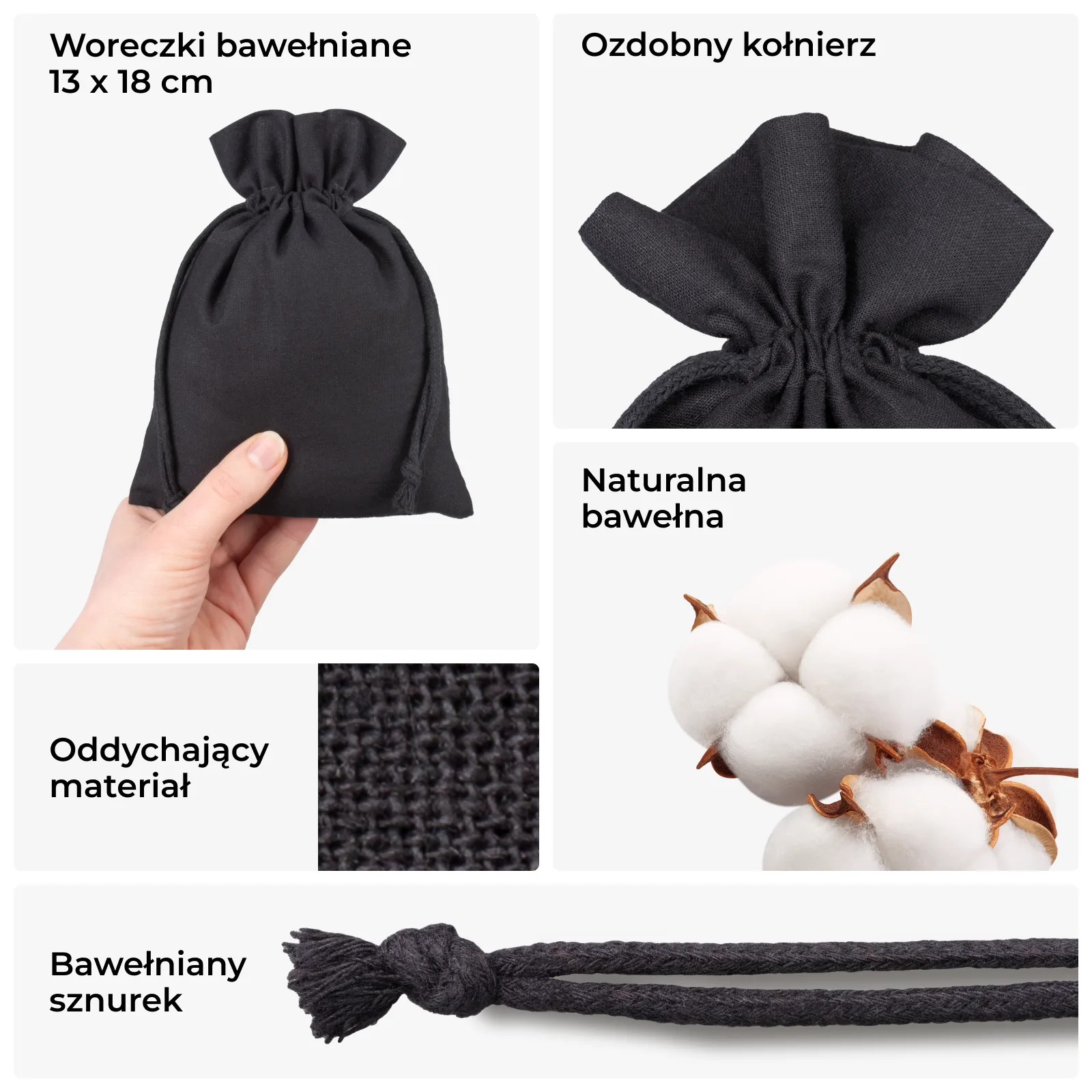 Niewielkie, ale o uniwersalnym zastosowaniu woreczki z eleganckiej bawełny w kolorze czarnym w rozmiarze 13 x 18 cm. Prezentowany pakiet składa się z 10 sztuk, dzięki czemu jednorazowy zakup praktycznych torebek wystarczy Ci na dłużej.