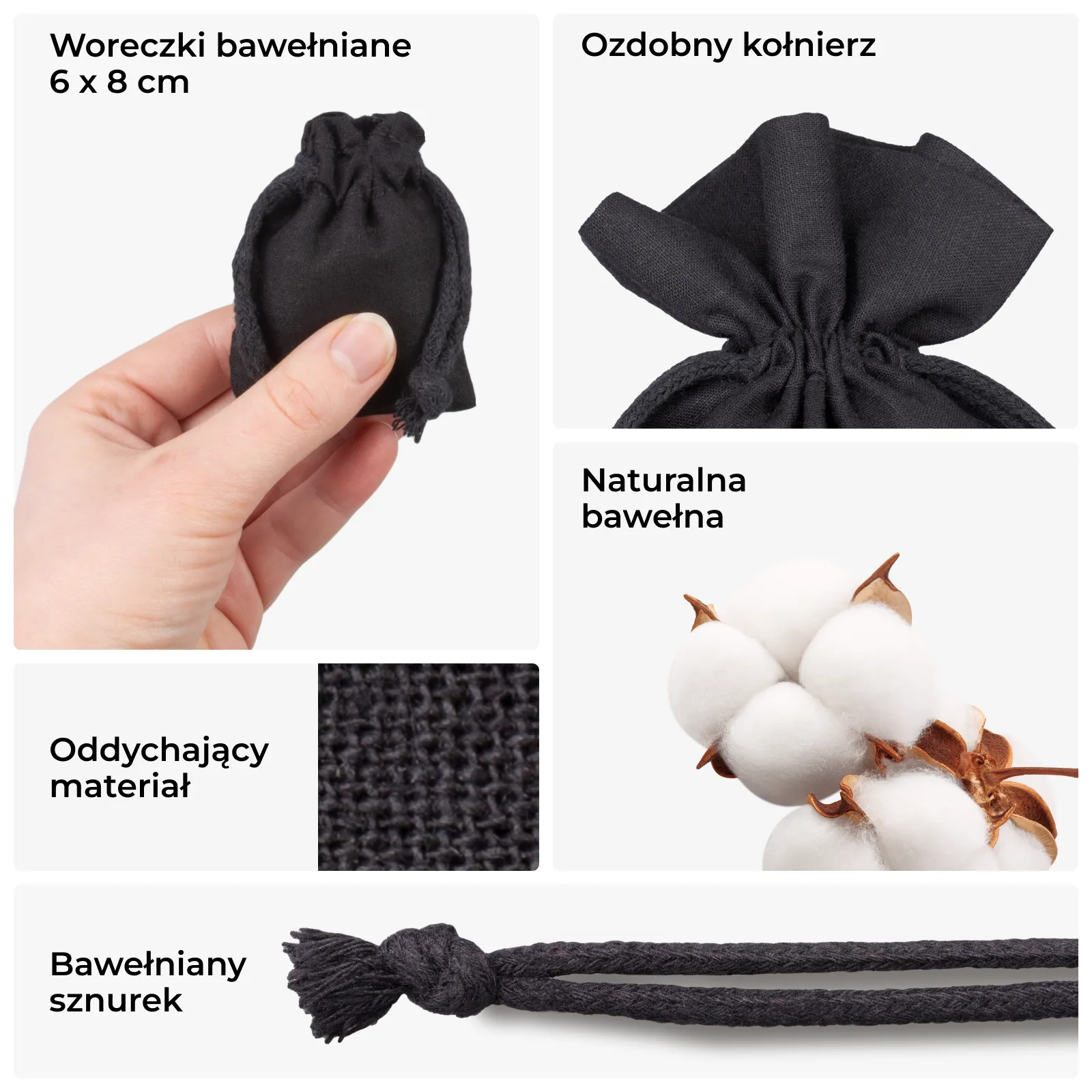 Jeśli potrzebujesz prostego i estetycznego opakowania na drobiazgi, ten zestaw 10 czarnych woreczków bawełnianych o gramaturze 140 g/m2 w małym formacie będzie dobrym wyborem. Dyskretnie skrywają zawartość, a jednocześnie nadają jej elegancki charakter.