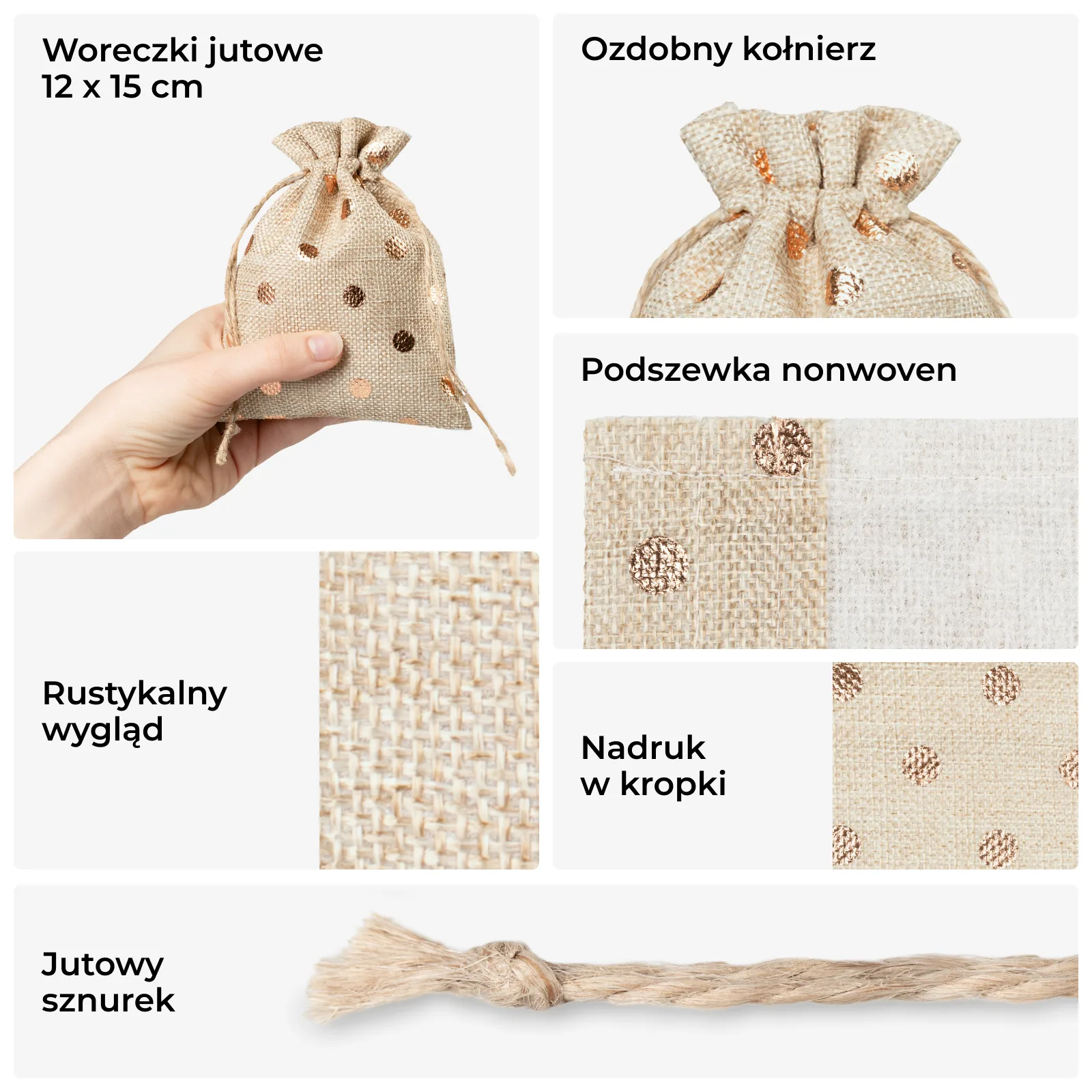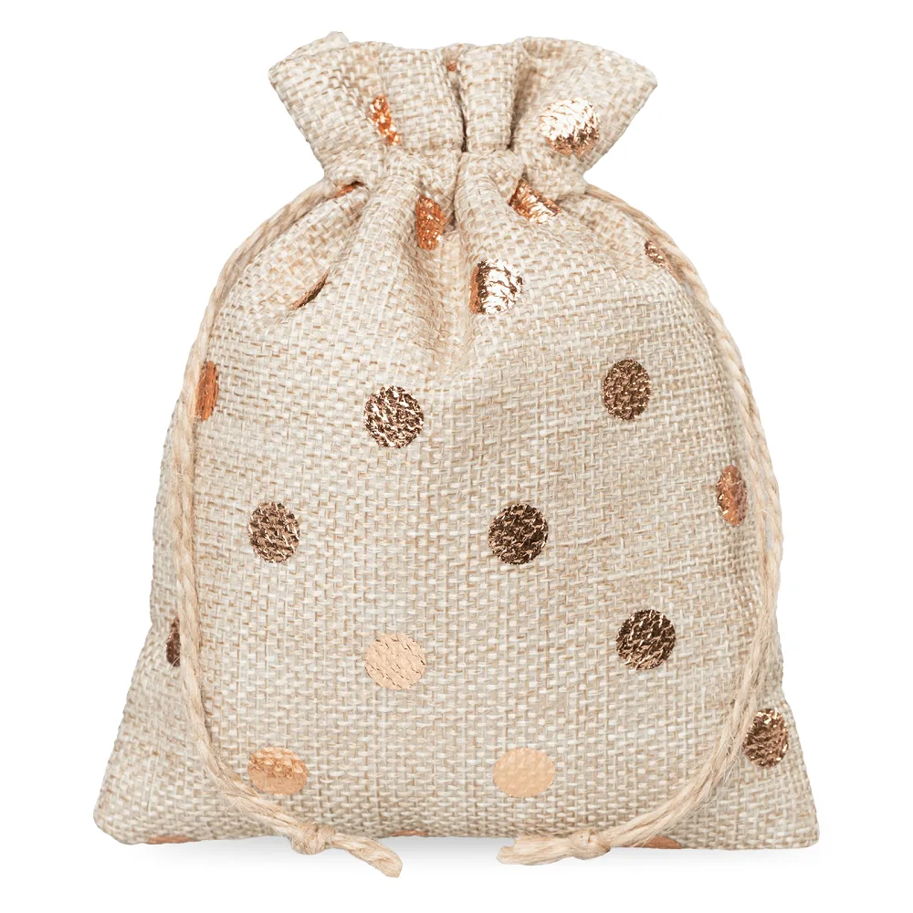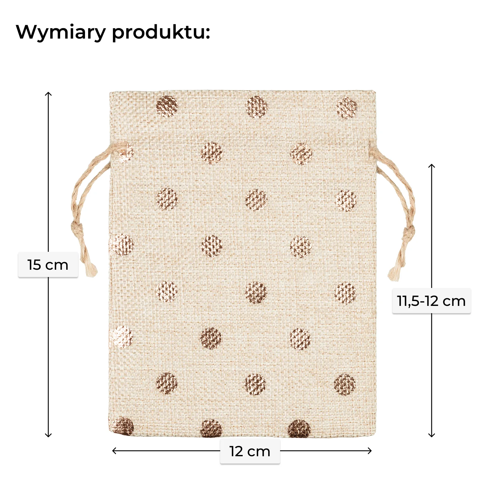 10 szt. Woreczki jutowe, małe 12 x 15 cm - naturalny kolor, nadruk w dekoracyjne złote kropki