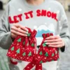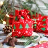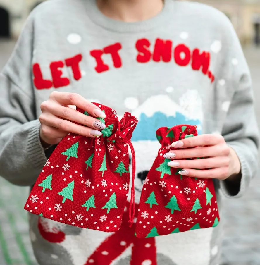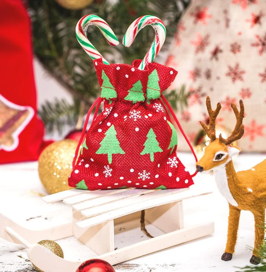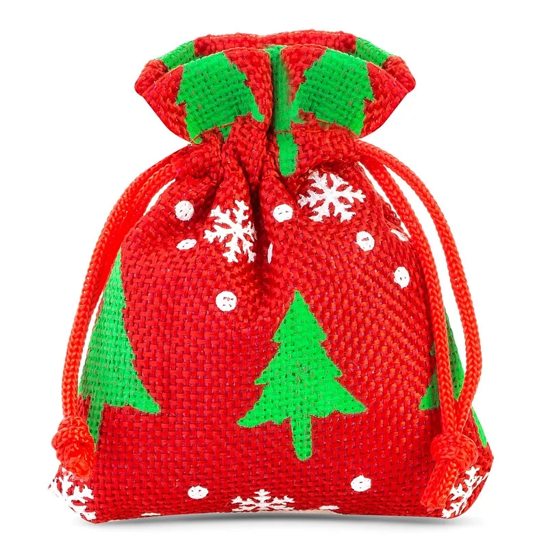 10 szt. Woreczki jutowe z nadrukiem 8 x 10 cm - czerwone / choinka