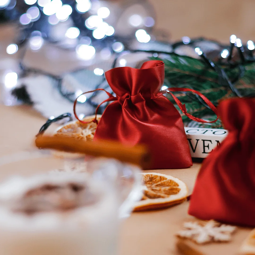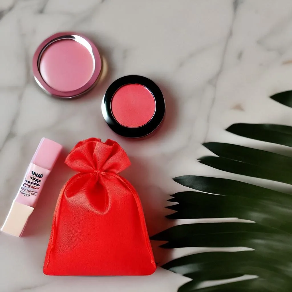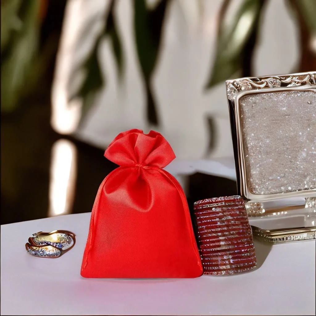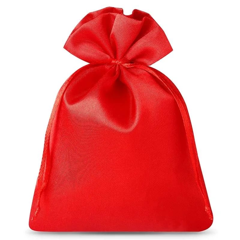 Kolekcja ozdobnych woreczków z czerwonej satyny o wymiarach 6 x 8 cm w ilości 10 sztuk.