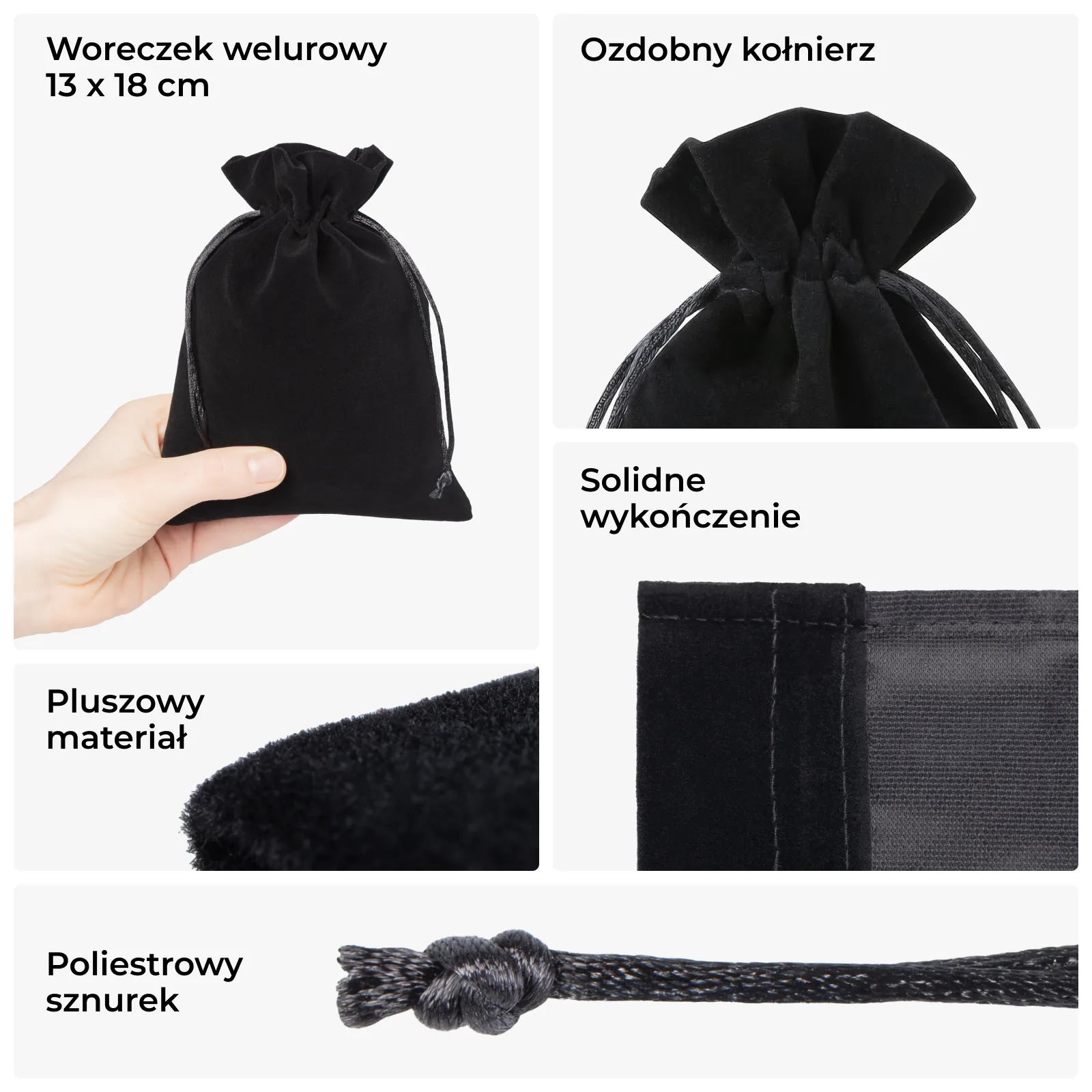 Głęboka, matowa czerń weluru to wymarzone tło dla Twojego logo. Nadruki w kolorze białym, srebrnym czy złotym prezentują się na nim niezwykle czytelnie i elegancko. Wykorzystaj potencjał personalizacji i stwórz woreczki welurowe, które będą niepowtarzalne - tak jak Twoja marka.