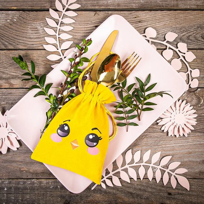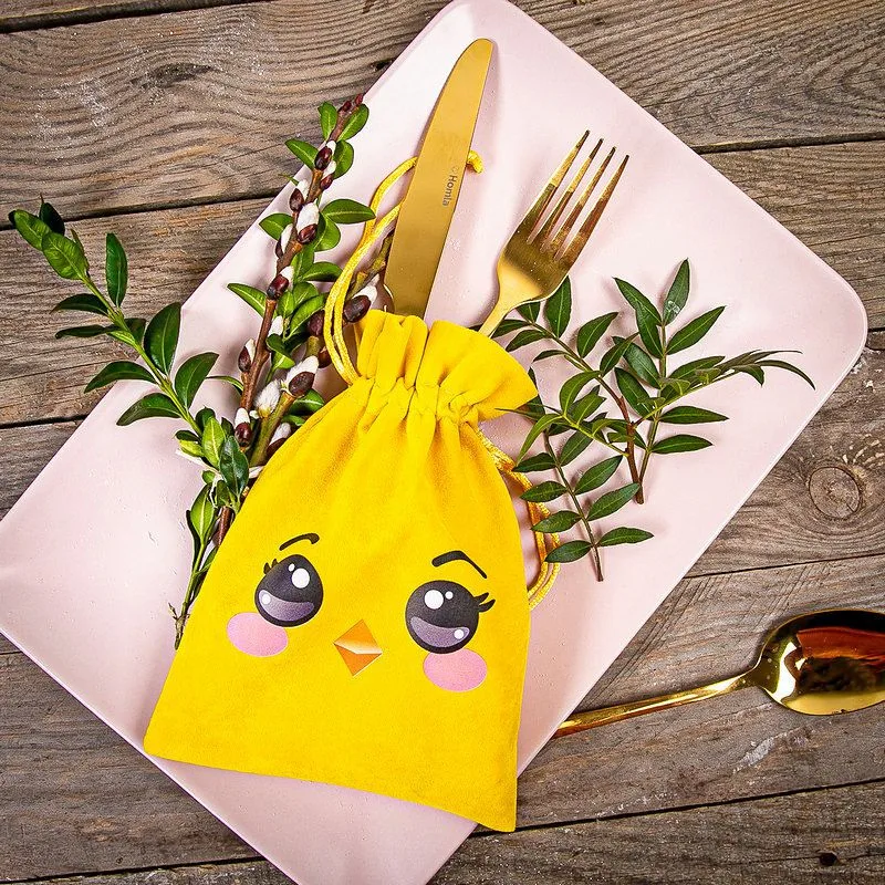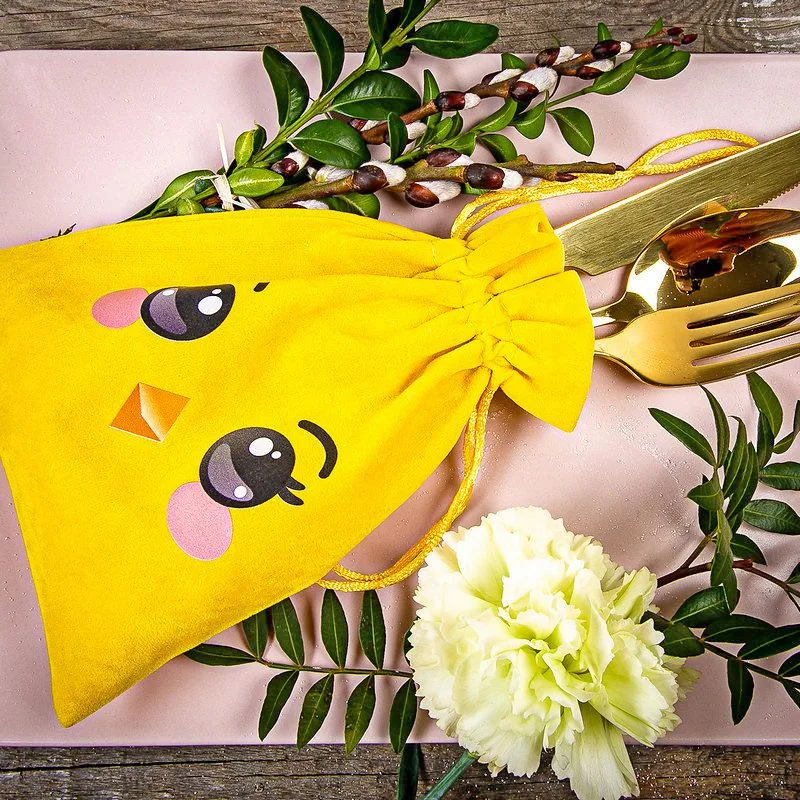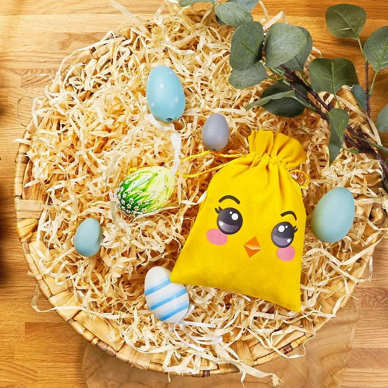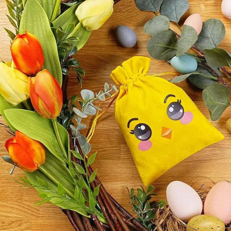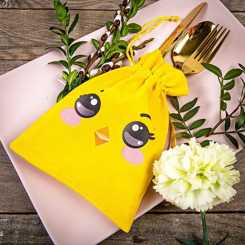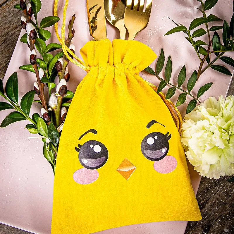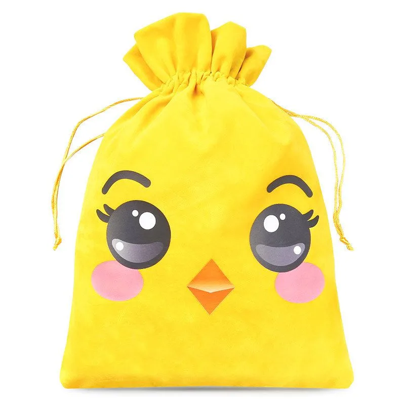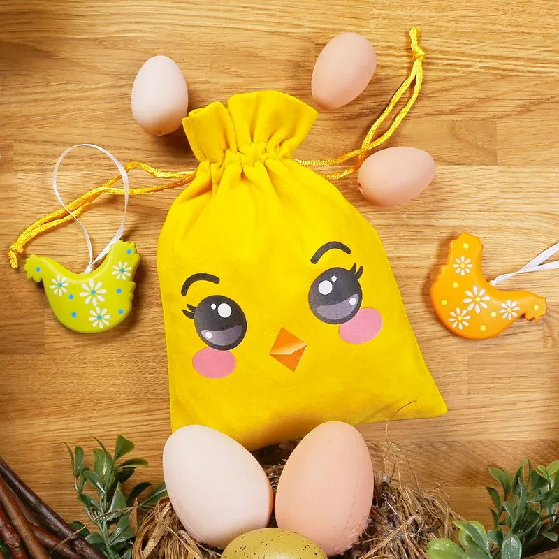 Tu zamówisz zestaw 10 sztuk uroczych woreczków welurowych w kolorze żółtym z wielkanocnym nadrukiem przedstawiającym kurczaczka. Oferowane tutaj torebeczki welurowe ze sznurkiem w ściągaczu mają wymiary 13 x 18 cm.