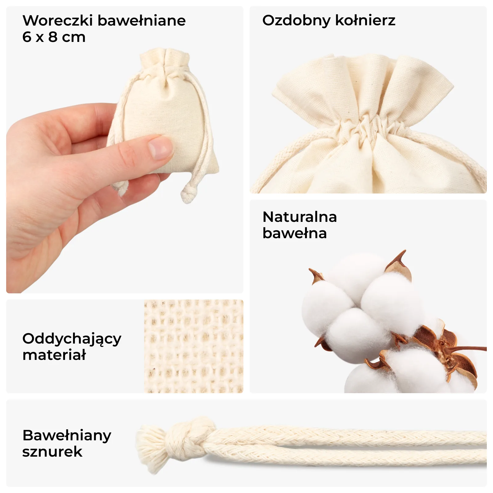 - Wygodne zamykanie: Woreczki zamykane są sznurkiem ze 100% bawełny, co jest praktyczne i estetyczne.