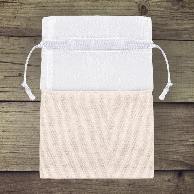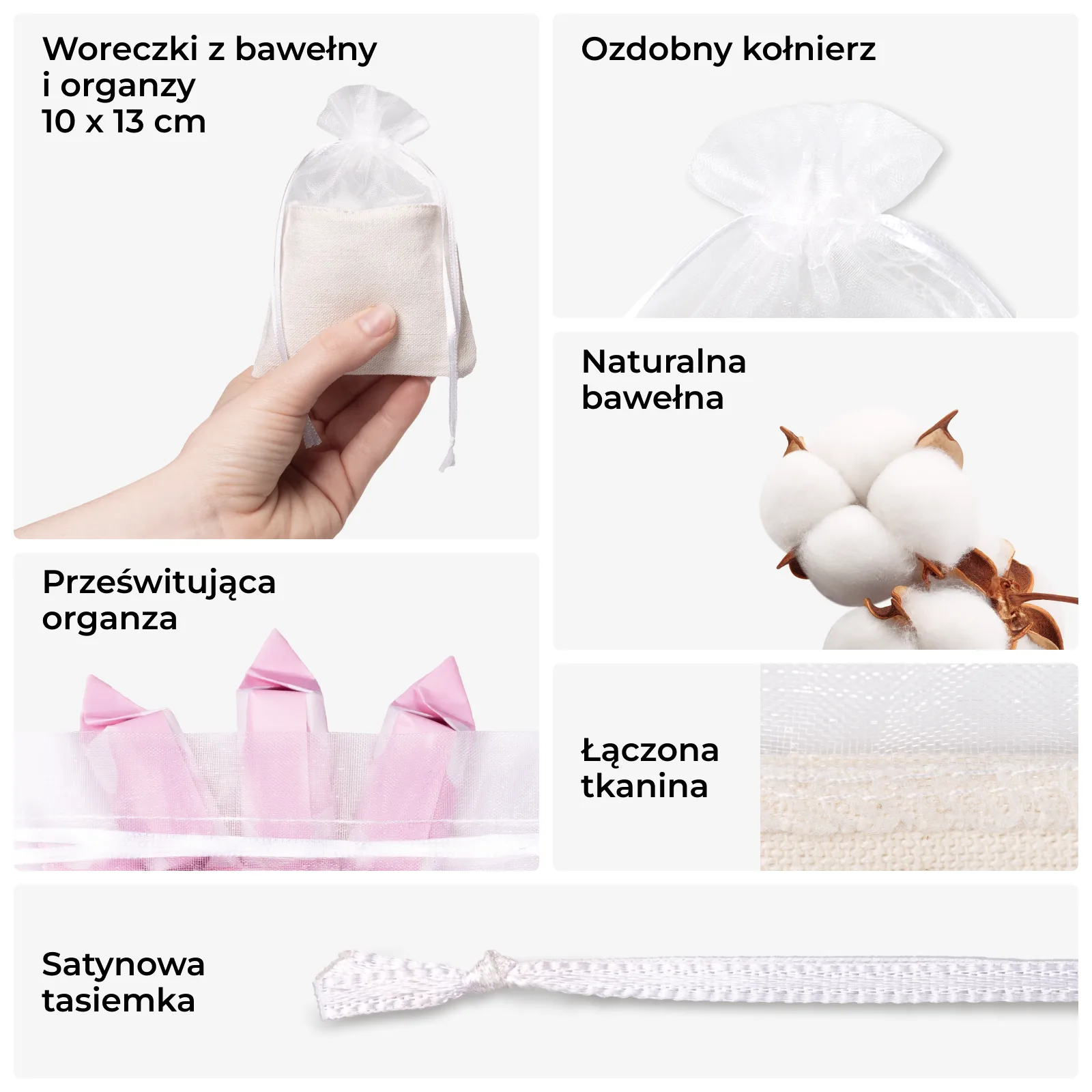 Ten model o wymiarach 10 x 13 cm wykonano z połączenia naturalnej bawełny i delikatnej organzy. Dzięki temu woreczki są przyjazne dla środowiska i prezentują się wyjątkowo estetycznie. Całość dopełnia satynowa tasiemka w kolorze białym, umożliwiająca szybkie i efektowne zamknięcie woreczka.
