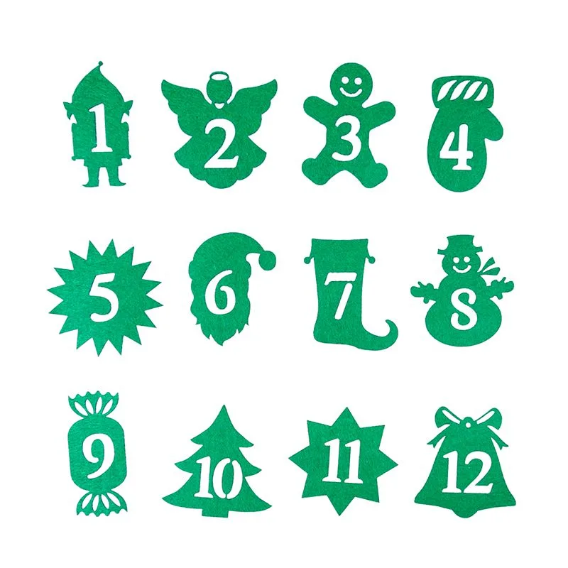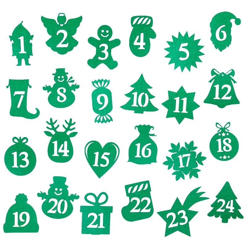 Oferujemy zestaw 24 szt. fantastycznych naklejek z filcu w kolorze zielonym (6,5 cm - 9 cm). Ten zestaw numerków (liczby od 1 do 24) stanowi doskonały dodatek do kalendarza adwentowego DIY. Dzięki nim w kilka chwil przygotujesz własnoręcznie efektowną dekorację świąteczną.