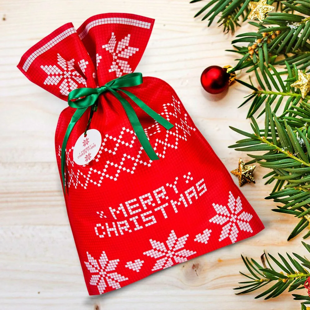 Nasze świąteczne worki na prezenty wykonane są z wytrzymałej fizeliny, która jest odporna na rozdarcia i świetnie się prezentuje. Intensywna czerwień w połączeniu z białym, świątecznym motywem tworzy klasyczną i uniwersalną kompozycję, która podkreśli charakter każdego upominku. Wymiary 20 x 30 cm sprawiają, że woreczki są niezwykle wszechstronne.