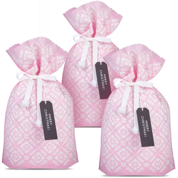 3 szt. Worki fizelinowe (nonwoven) różowe z motywem świątecznym, 30 x 45 cm - na prezenty