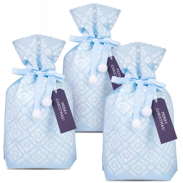 Zamów już dziś zestaw 3 błękitnych worków świątecznych i ciesz się bezstresowym i efektownym pakowaniem prezentów.