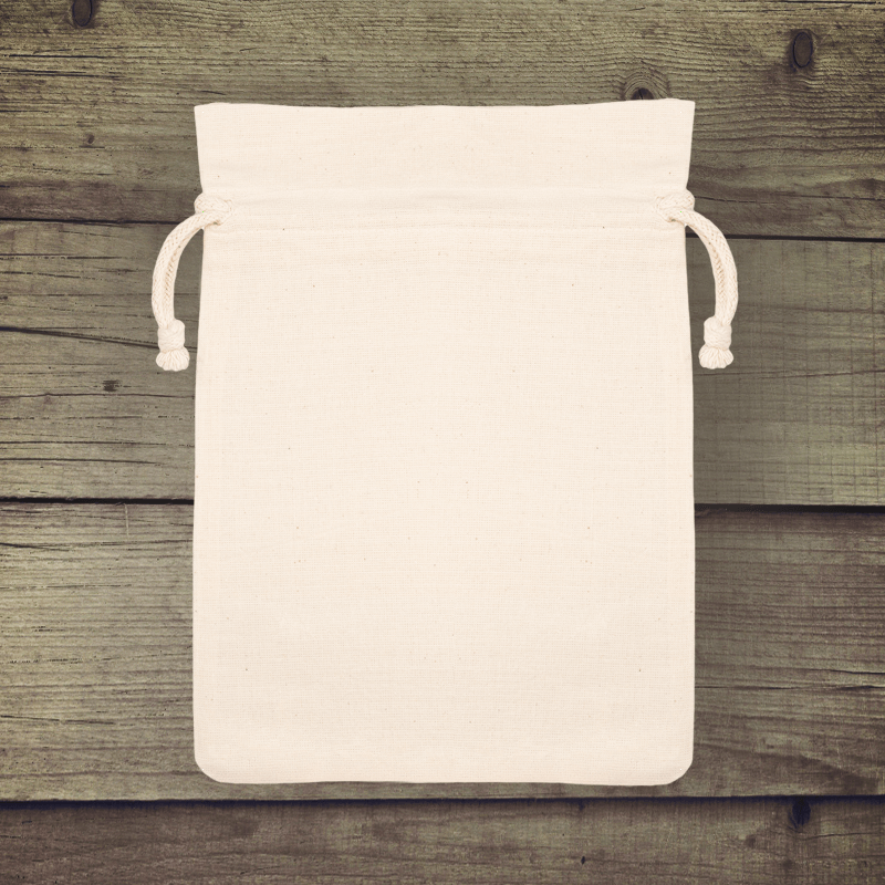 Wytrzymały i praktyczny worek bawełniany o wymiarach 26 x 35 cm, ściągany naturalnym sznurkiem.