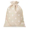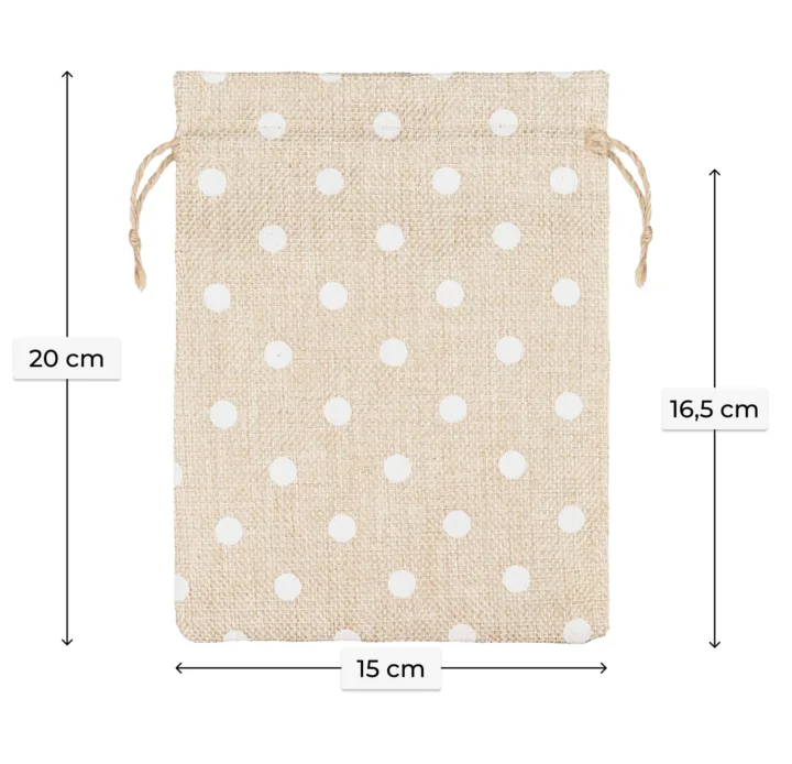 5 jasnych woreczków jutowych 15x20 cm - z kołnierzem i groszkowym nadrukiem