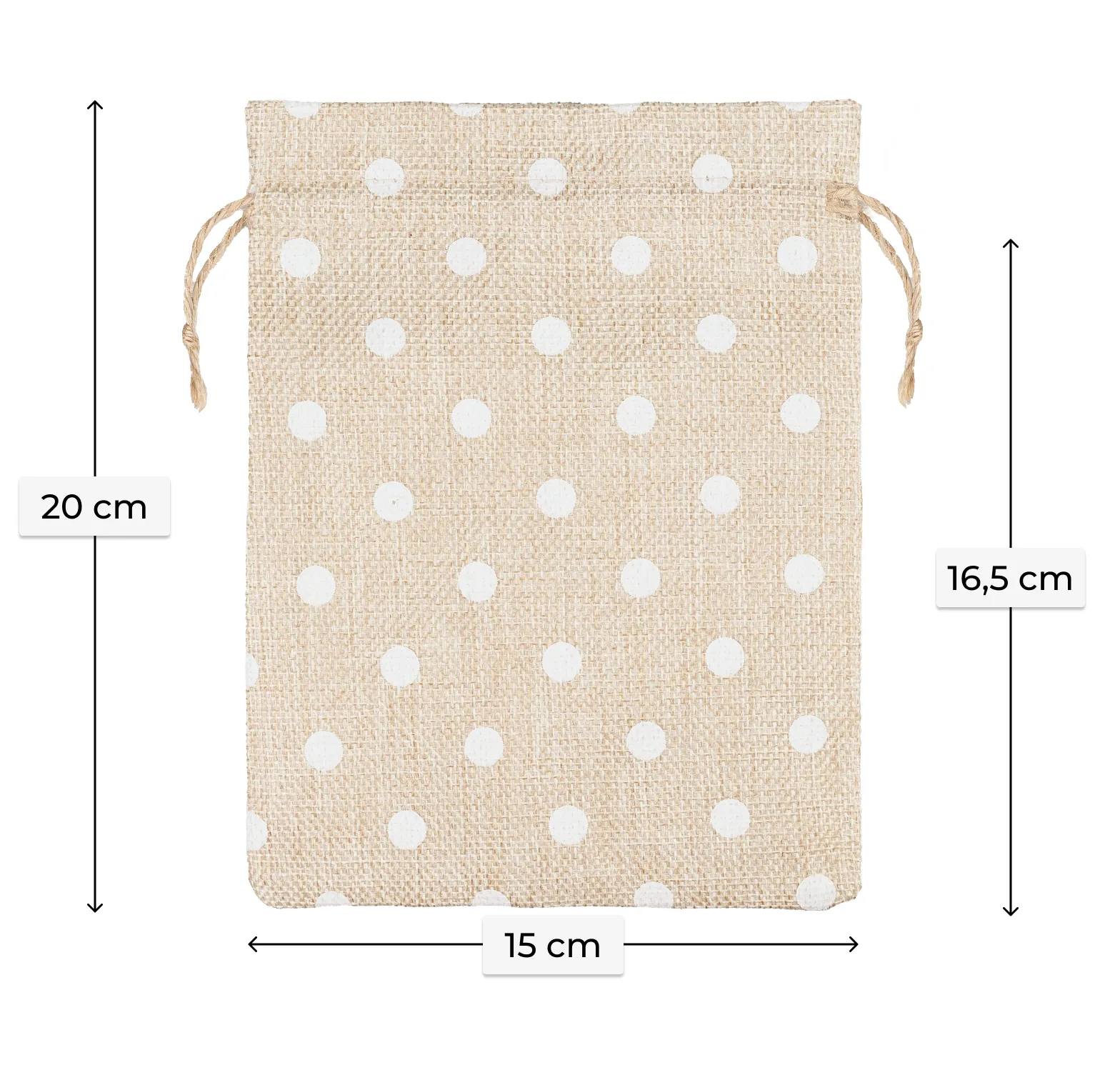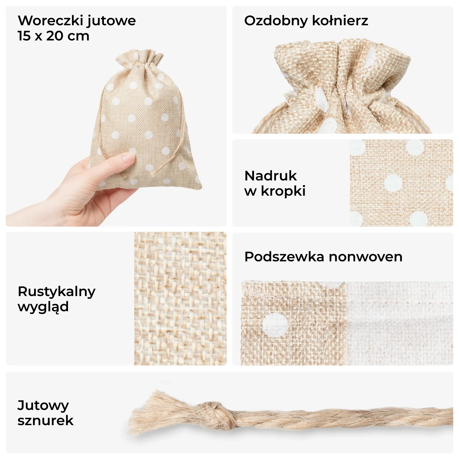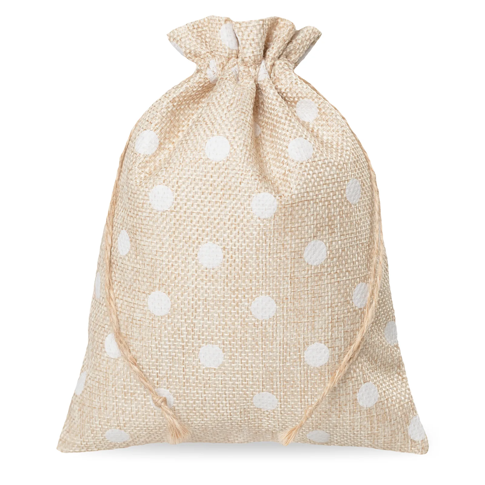 Zestaw pięciu średniej wielkości woreczków jutowych w odcieniu naturalnego jasnego, ozdobionych eleganckim nadrukiem w groszki i dekoracyjnym kołnierzem. To doskonałe rozwiązanie dla firm i osób prywatnych szukających efektownego i praktycznego sposobu na pakowanie produktów, gadżetów lub upominków.