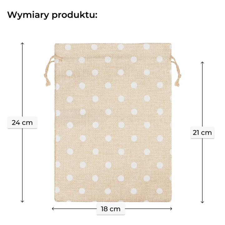 Połącz klasykę z delikatną dekoracją dzięki woreczkom jutowym z nadrukiem w kropki. To stylowe i praktyczne rozwiązanie dla marek, które cenią rustykalny klimat i subtelne detale wizualne. W zestawie znajduje się 5 woreczków o średnim rozmiarze, idealnych do pakowania produktów i prezentów.