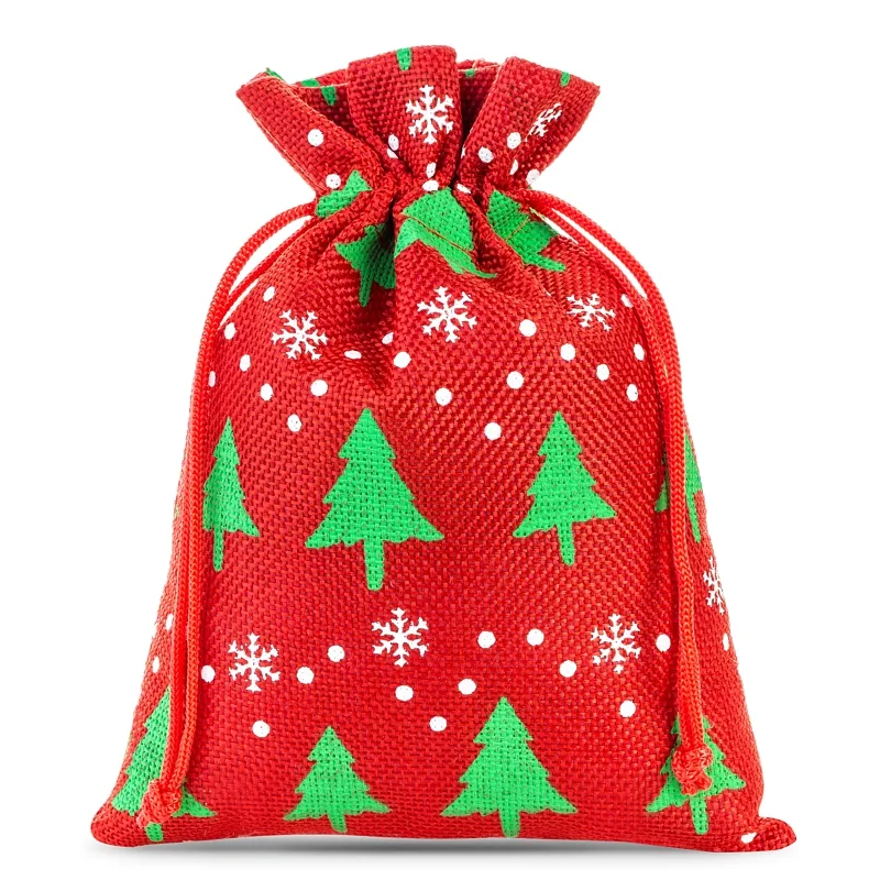 5 szt. Woreczki jutowe z nadrukiem 18 x 24 cm - czerwone / choinka
