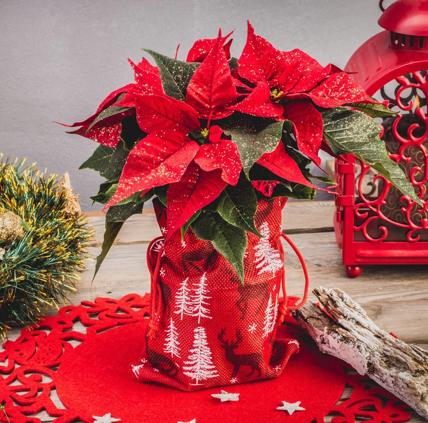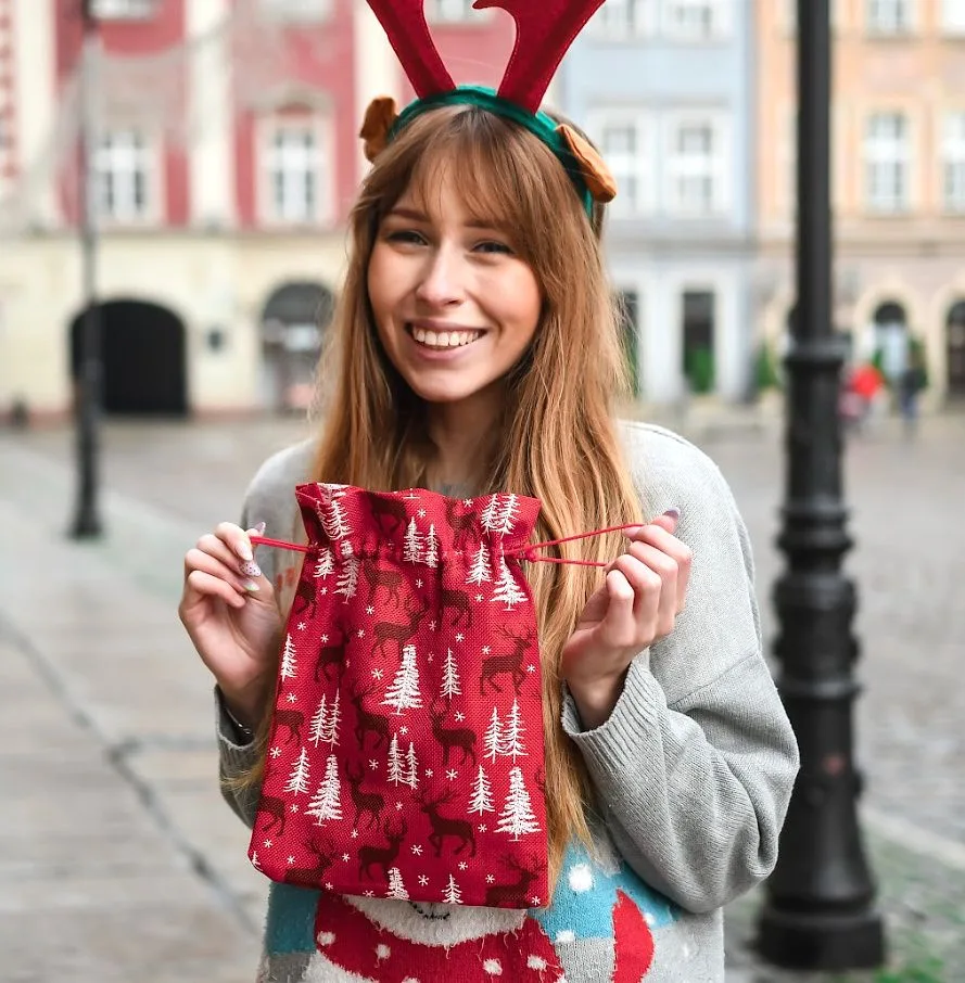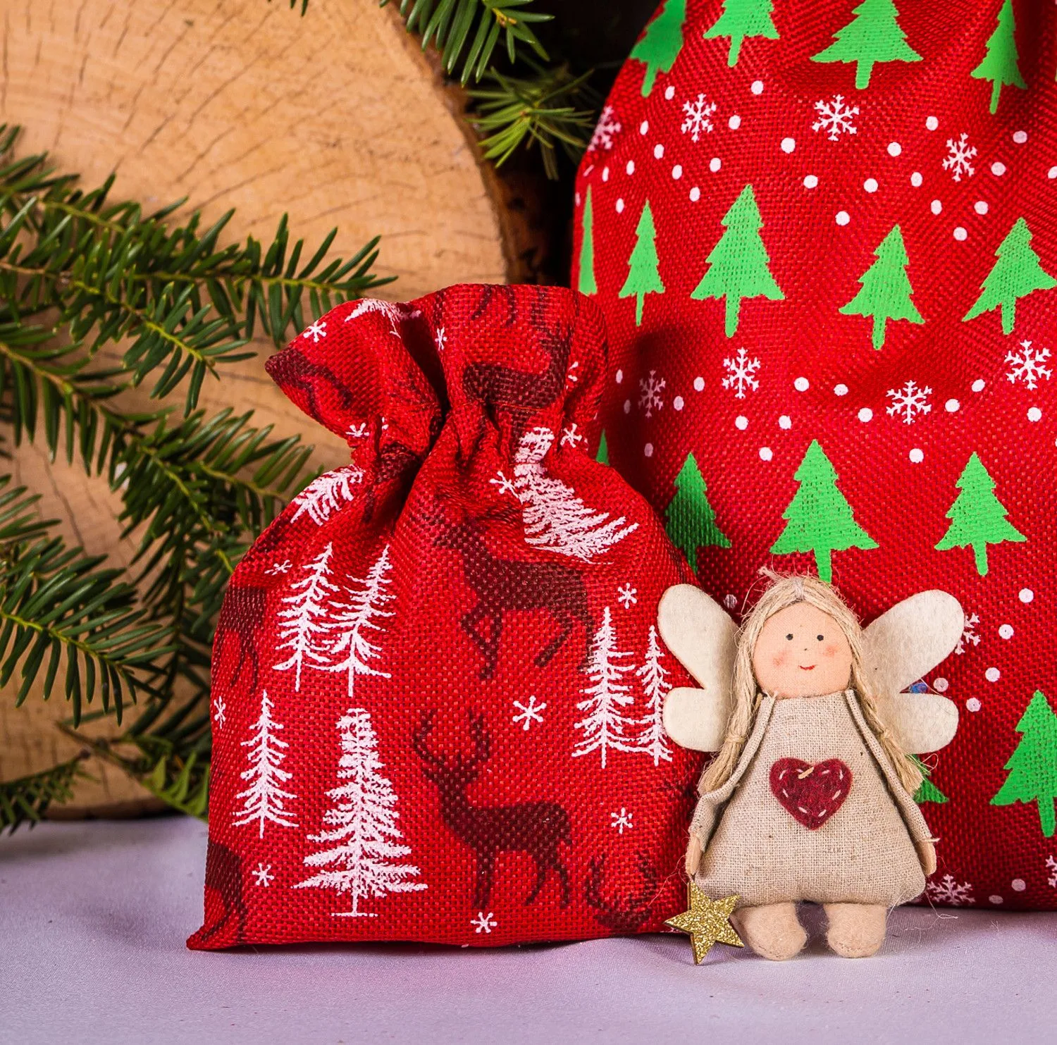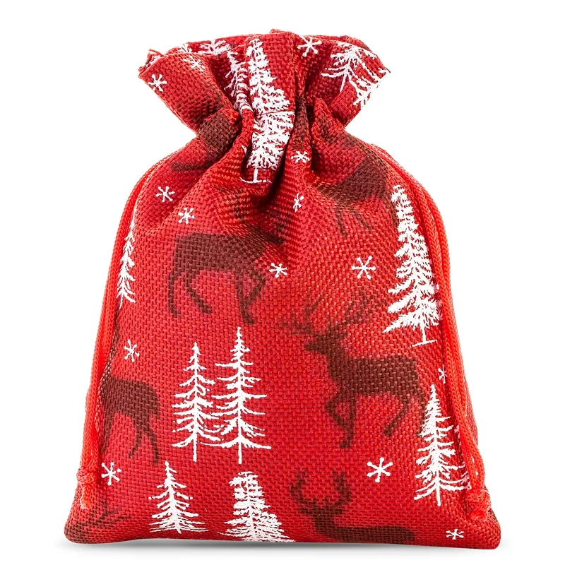 5 szt. Woreczki jutowe z nadrukiem 18 x 24 cm - czerwone / renifer