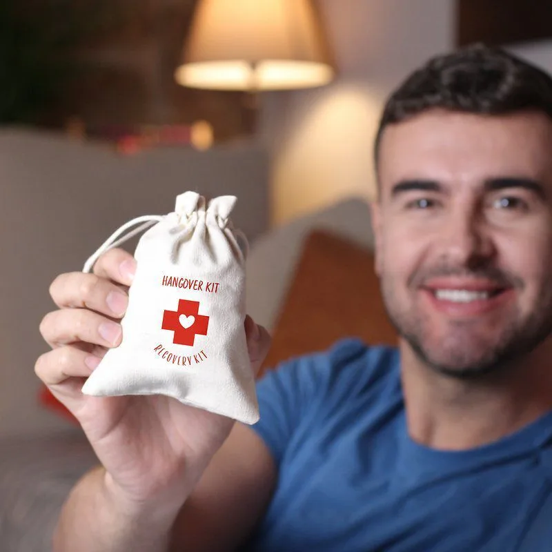 W tym miejscu zamówisz zestaw 5 sztuk pojemnych woreczków lnianopodobnych z nadrukiem "Hangover Kit" do samodzielnego wypełnienia (bez zawartości). W woreczkach można umieścić np. słodką przekąskę, plastry, napój izotoniczny, gumę do żucia, saszetkę z kawą, elektrolity, witaminy, tabletkę na ból głowy. To doskonały pomysł na oryginalny i praktyczny upominek, który zaskoczy i rozbawi Twoich gości!