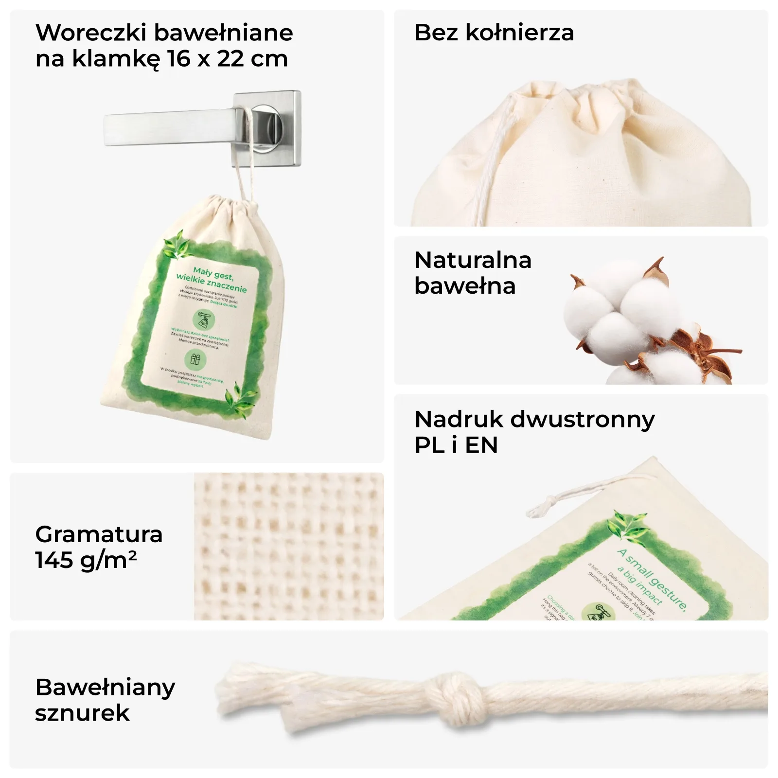 Bawełniane woreczki hotelowe na klamkę 16 x 22 cm z dwustronnym nadrukiem - 5 szt.
