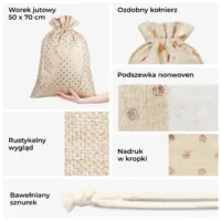 Worki w rozmiarze 50×65 cm są niezwykle wszechstronne i znajdą zastosowanie w wielu obszarach. Mogą służyć jako worki na prezenty świąteczne, mieszczące upominki dla całej rodziny, tworząc niezapomnianą atmosferę. Są idealne do przechowywania i segregacji odzieży, koców czy poduszek, pomagając utrzymać porządek w szafie i garderobie. W branży hotelarskiej sprawdzą się jako eleganckie worki na brudną pościel lub na dodatkowe koce dla gości, podnosząc standard obsługi. Ponadto, mogą pełnić funkcję opakowań na duże produkty w sklepach e-commerce, zapewniając estetyczną i bezpieczną dostawę.