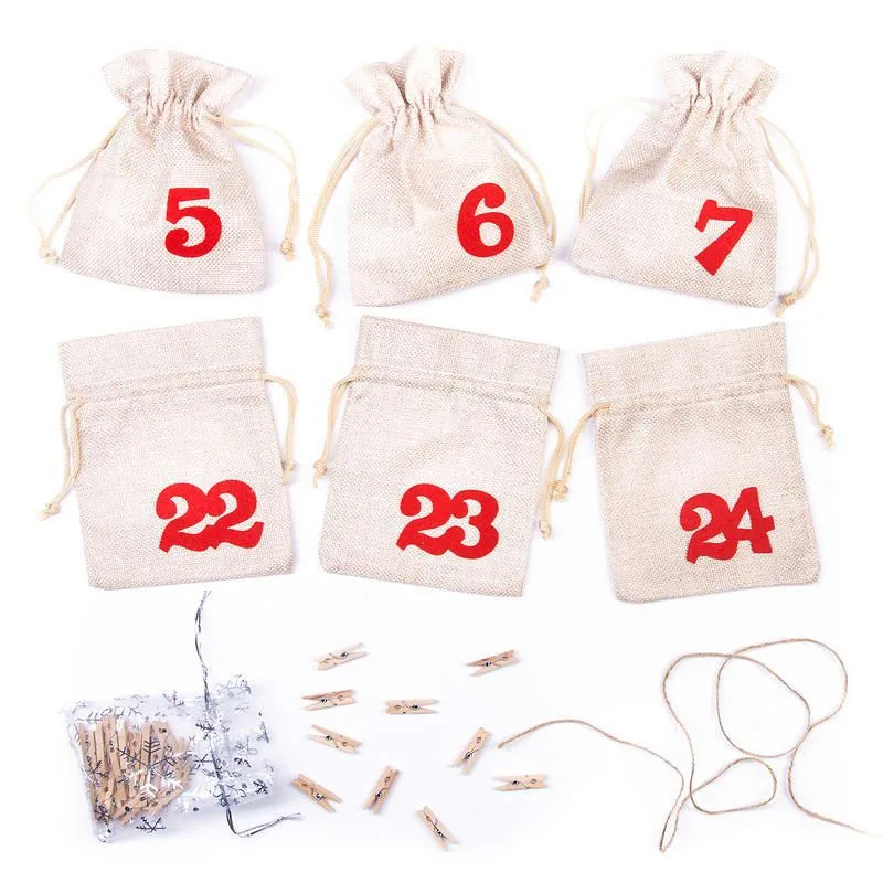 1 szt. Kalendarz adwentowy woreczki jutowe 12 x 15 cm - naturalne jasne + czerwone numery