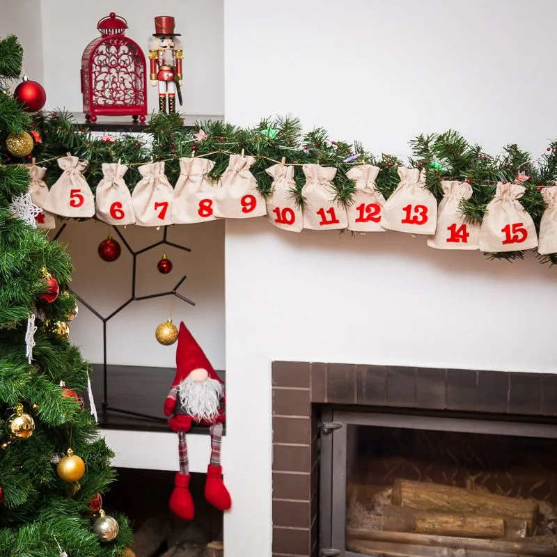 Oferujemy kompletny zestaw do przygotowania kalendarza adwentowego w formie ozdobnej girlandy z woreczków. To wspaniała ozdoba, którą można zawiesić na ścianie lub np. nad kominkiem.