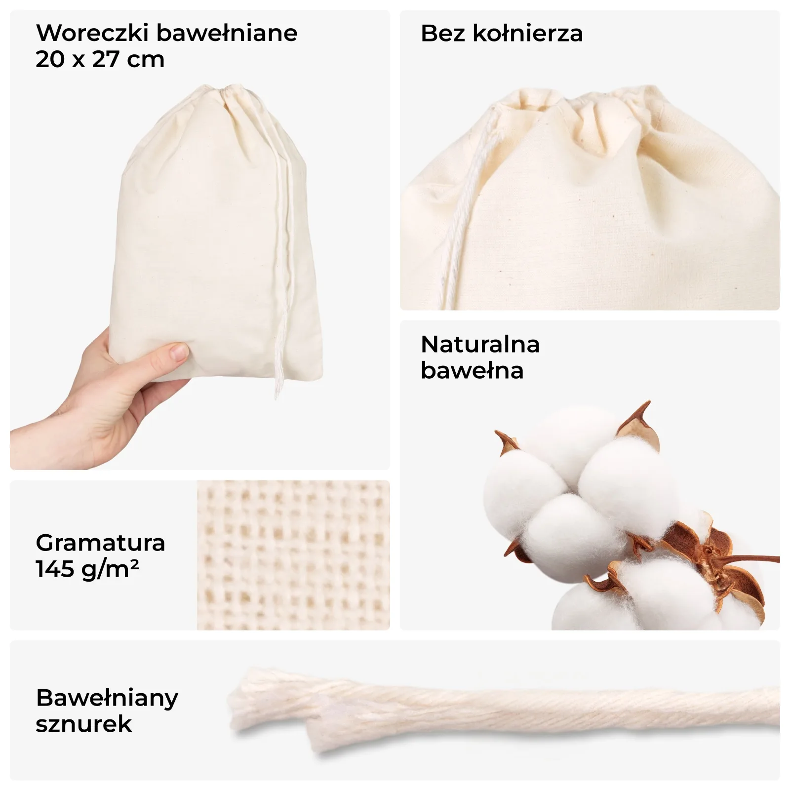 Oferujemy zestaw 5 sztuk woreczków płóciennych 20x27 cm, uszytych ze 100% bawełny w naturalnym kolorze. To model bez kołnierza, zamykany z jednej strony pojedynczym, skręcanym sznurkiem. Dzięki temu woreczki są proste, praktyczne i dają więcej możliwości - możesz je łatwo zaciągnąć, zawiązać na kokardkę, przypiąć metkę z ceną lub bilecik prezentowy.