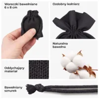 Woreczki w rozmiarze 6×8 cm są niezwykle wszechstronne i znajdą zastosowanie w wielu obszarach. Mogą służyć do pakowania pojedynczych pralinek lub cukierków, dodając im elegancji. Są idealne jako woreczki na biżuterię – pierścionki, kolczyki-wkrętki, zawieszki, chroniąc je przed uszkodzeniami. Doskonale sprawdzą się na próbki kremów, perfum w fiolkach czy sypkich kosmetyków, zapewniając estetyczną prezentację. Mogą być używane do przechowywania kart pamięci, małych pendrive’ów, utrzymując porządek. Ponadto, są idealne jako woreczki na szczęście z małymi kamieniami lub talizmanami, dodając im symbolicznego znaczenia.