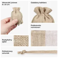 Mimo niewielkiego rozmiaru, oferujemy szeroki wybór materiałów, abyś mógł idealnie dopasować opakowanie do swojego produktu. Lekkie i przezroczyste woreczki z organzy pięknie eksponują zawartość i są idealne na małe kolczyki, zawieszki czy kolorowe koraliki, dodając im lekkości. Miękkie i luksusowe woreczki welurowe doskonale chronią delikatne przedmioty przed zarysowaniem i są niezastąpione do pakowania pierścionków czy małych kamieni szlachetnych, zapewniając im godną oprawę. Naturalne i w stylu eko woreczki jutowe są świetne na nasiona, małe mydełka rzemieślnicze czy jako element rustykalnych dekoracji, wprowadzając ciepły klimat. Wytrzymałe i stylowe woreczki à la lniane są doskonałe na małe upominki firmowe lub jako opakowania na suszone zioła, podkreślając ich naturalny charakter.