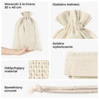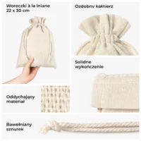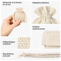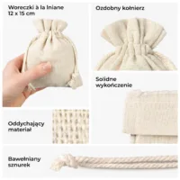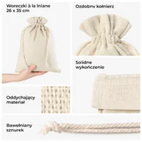- Dekoracje stołu: Nasze woreczki mogą służyć jako oryginalne winietki, etui na sztućce lub element centralnej kompozycji na stołach.