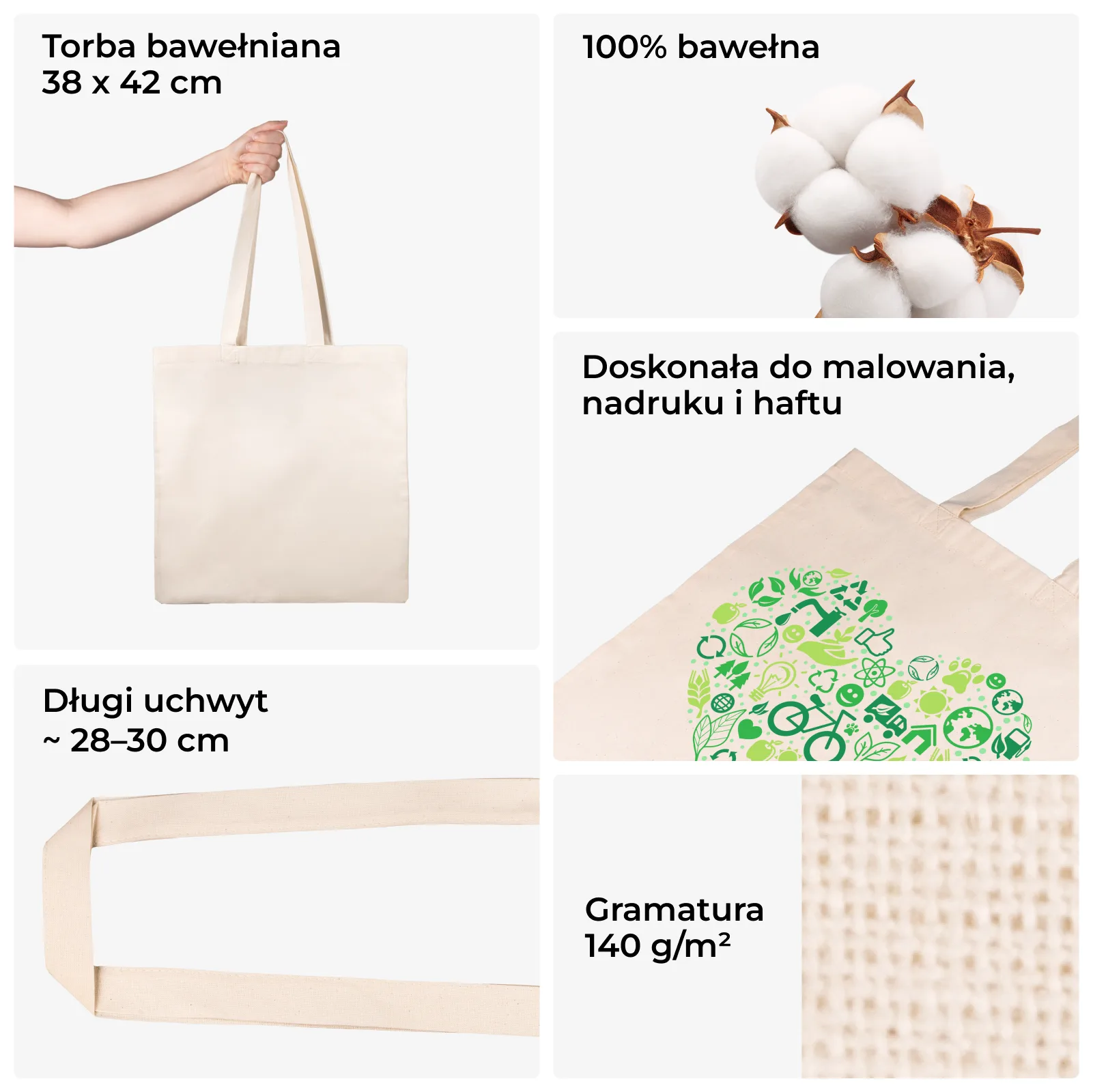- Wysoka gramatura 140 g/m²: Gruba, solidna bawełna gwarantuje znacznie większą trwałość i odporność na przetarcia niż standardowe torby.