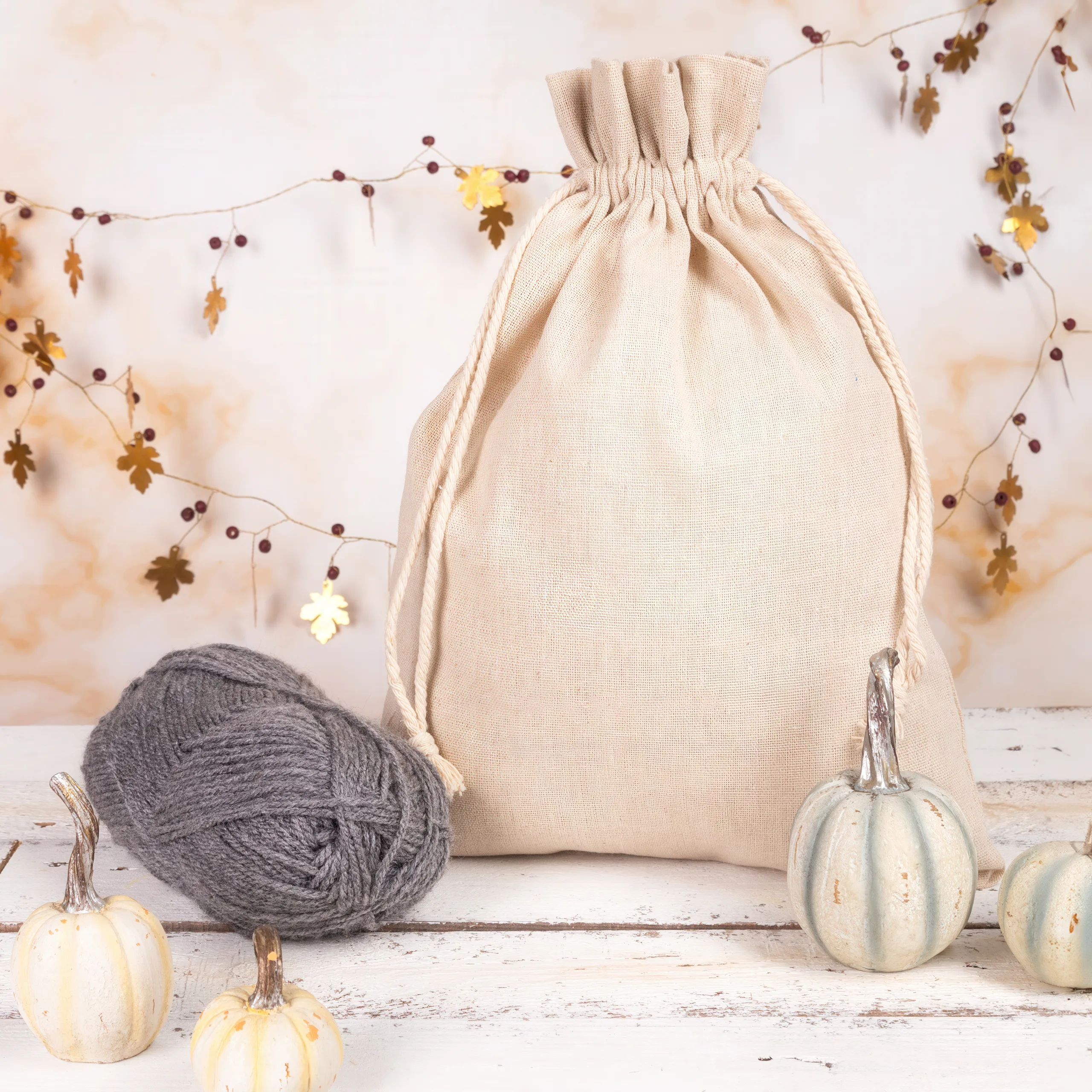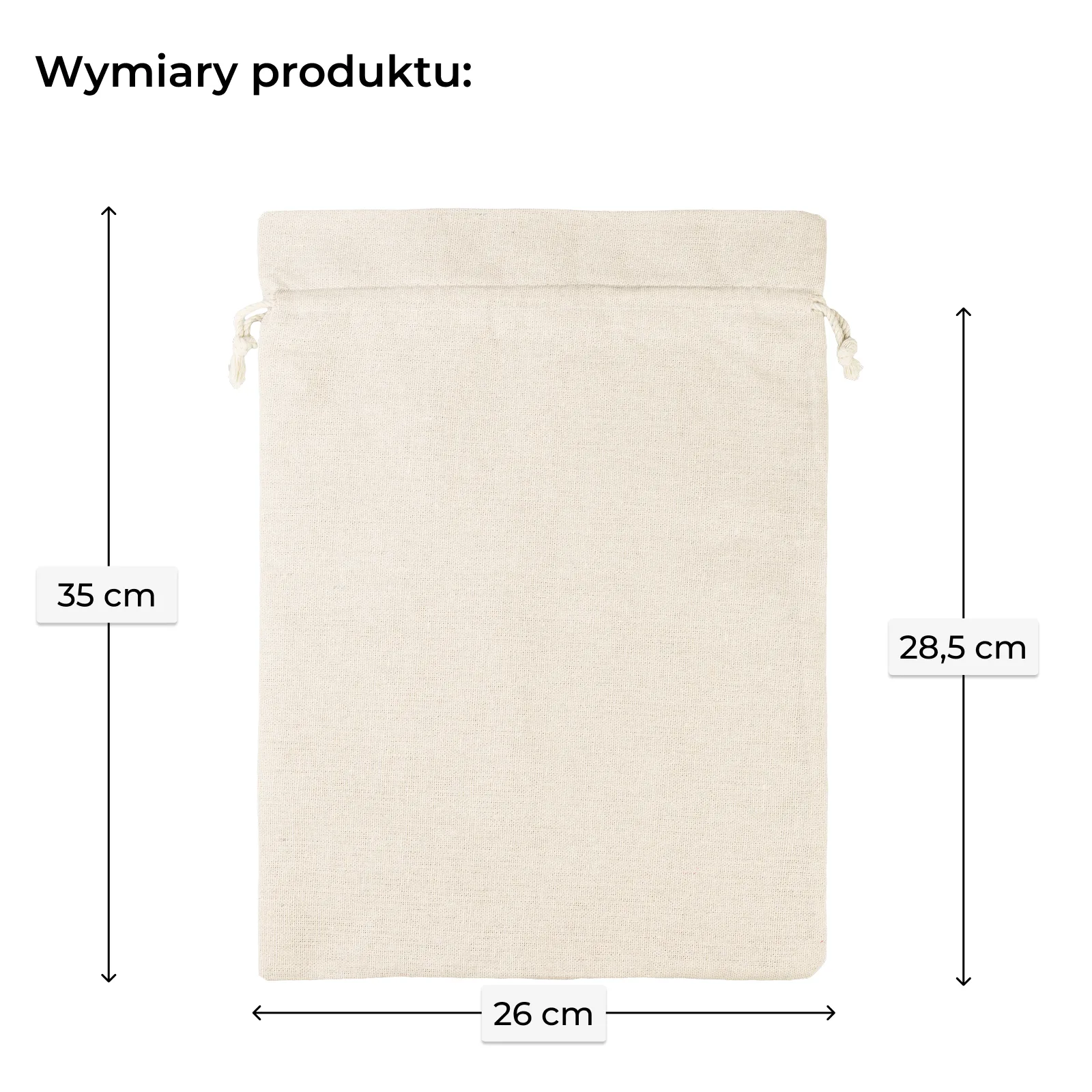 Worek powstaje z tkaniny à la len, czyli mieszanki bawełny i poliestru odwzorowującej splot oraz surowy wygląd klasycznego lnu. Materiał jest przewiewny, lekko szorstki w dotyku i jednocześnie bardziej odporny na zagniecenia niż tradycyjny len. Naturalny kolor oraz wyraźna faktura sprawiają, że worek pasuje do stylu rustykalnego, boho i minimalistycznego. Podwójny bawełniany sznurek pozwala na wielokrotne, wygodne użytkowanie, co czyni go trwałą alternatywą dla jednorazowych opakowań.