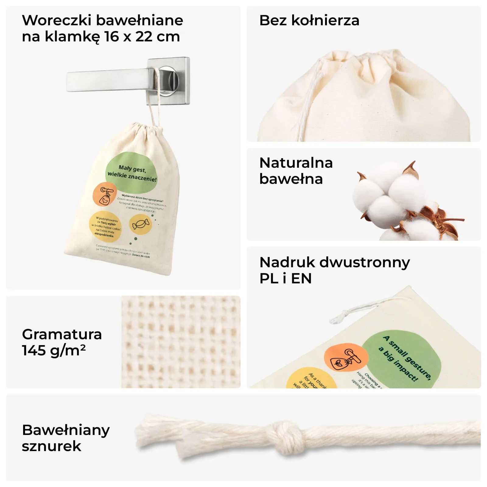Oferujemy woreczki bawełniane na klamkę. Praktyczny zestaw 5 sztuk uszytych z bawełny. stworzonych z myślą o hotelowych programach ekologicznych zachęcających gości do rezygnacji z codziennego sprzątania pokoju. Woreczki posiadają dwustronny, kolorowy nadruk z instrukcją akcji w języku polskim i angielskim.