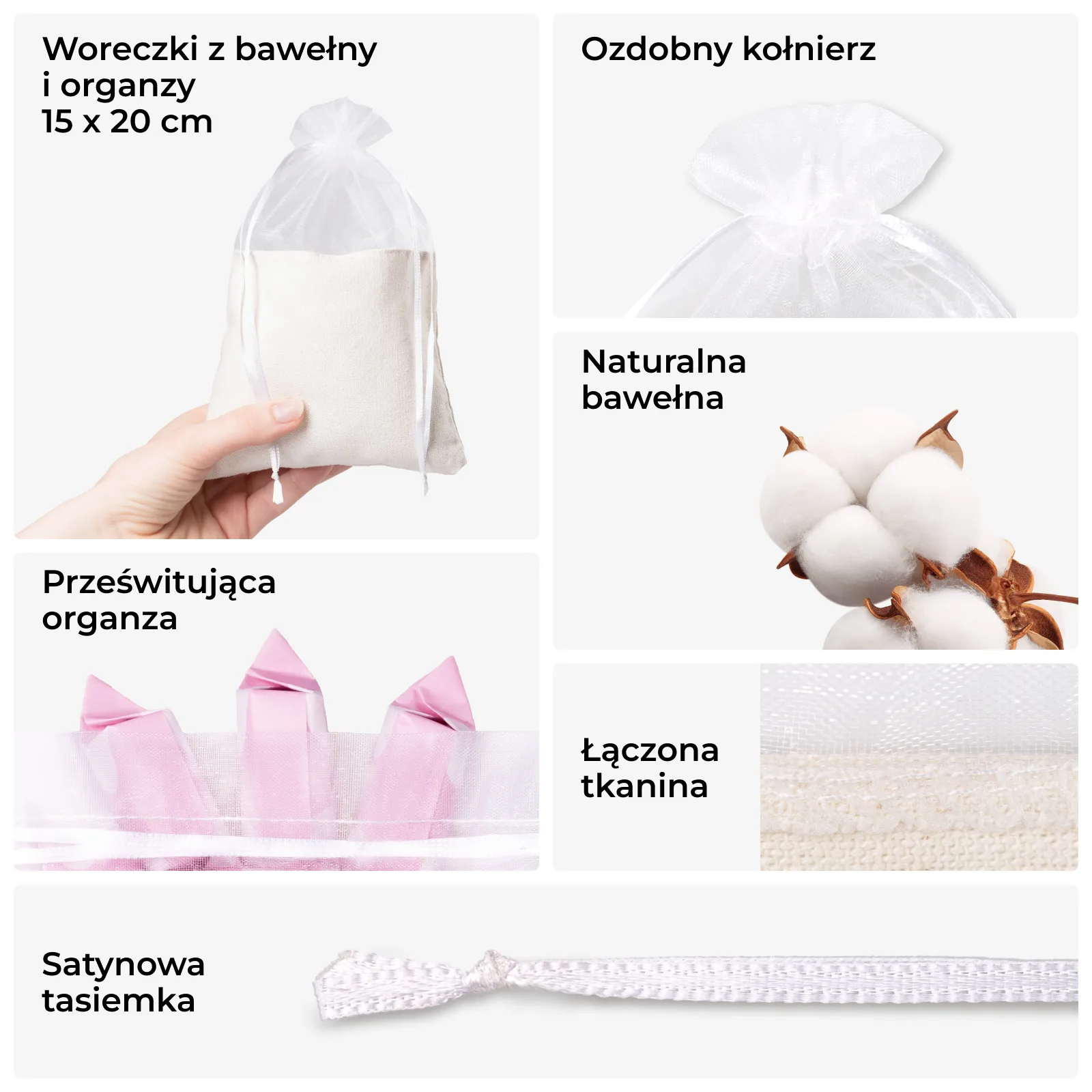 Woreczki bawełniano-organzowe 15x20 cm - 10 szt - prostota, która robi wrażenie