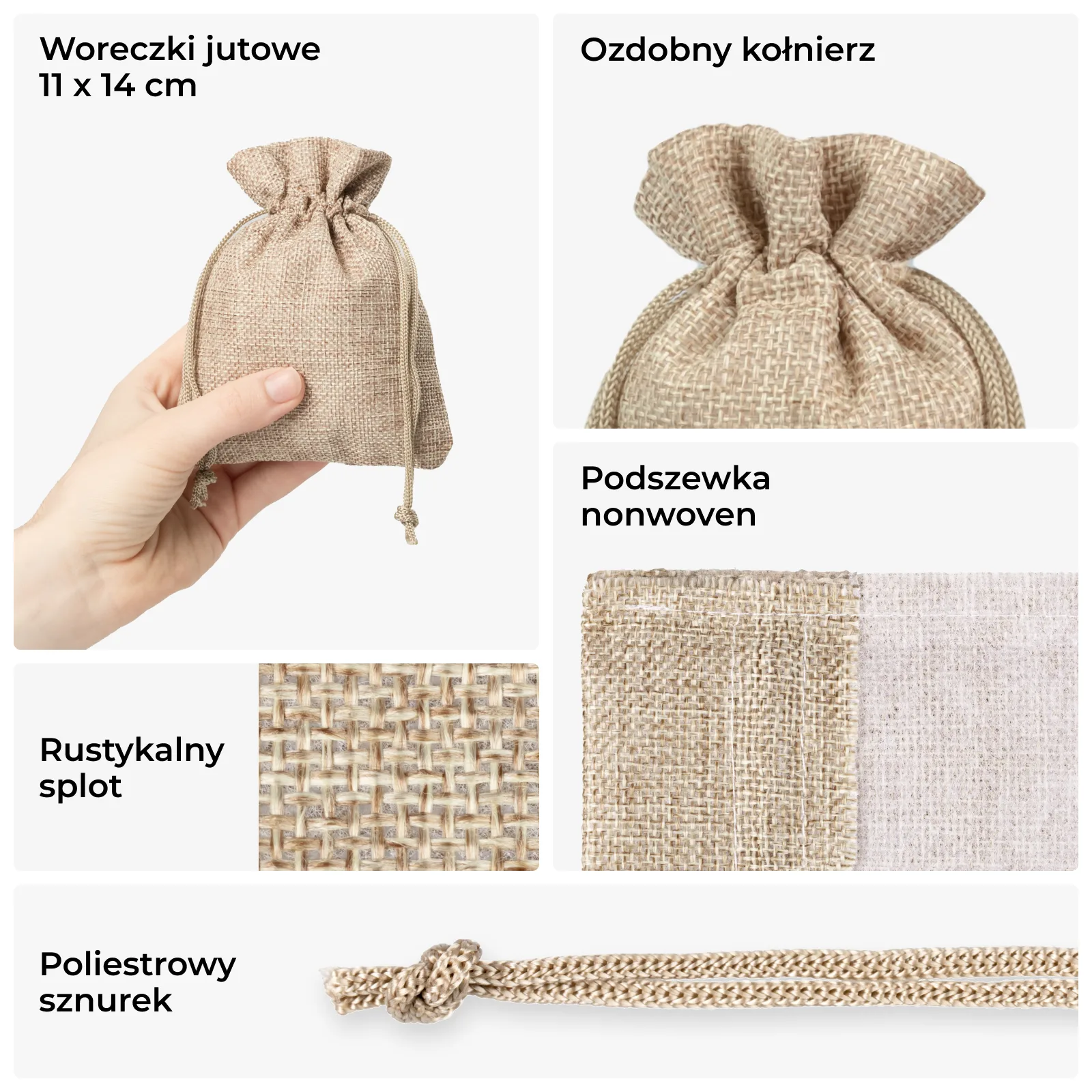 Niewielkie, bardzo uniwersalne woreczki z eleganckiej juty w kolorze naturalnym w rozmiarze 11 cm x 14 cm. Prezentowany pakiet składa się z 10 sztuk, dzięki czemu jednorazowy zakup może wystarczyć na dłuższy czas.