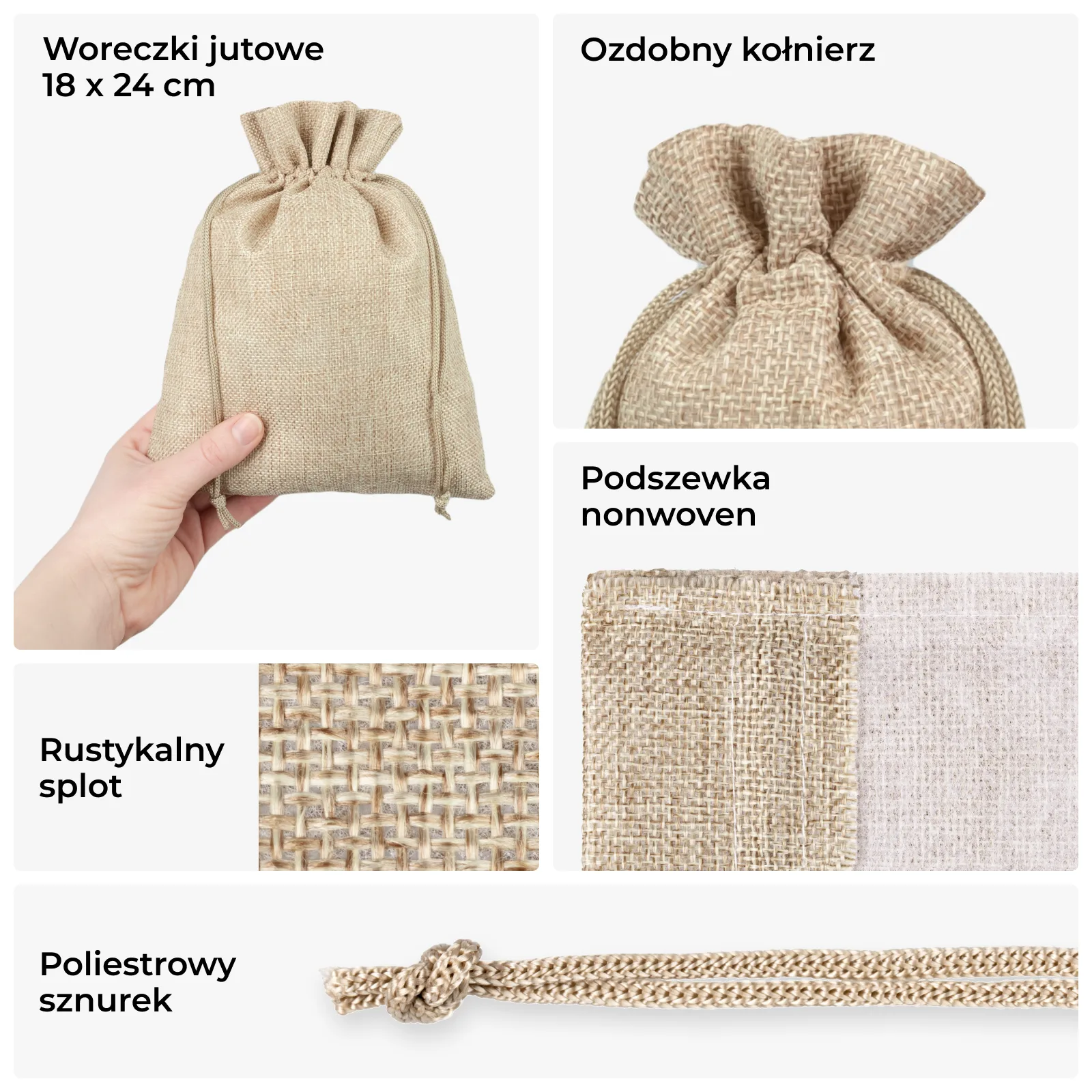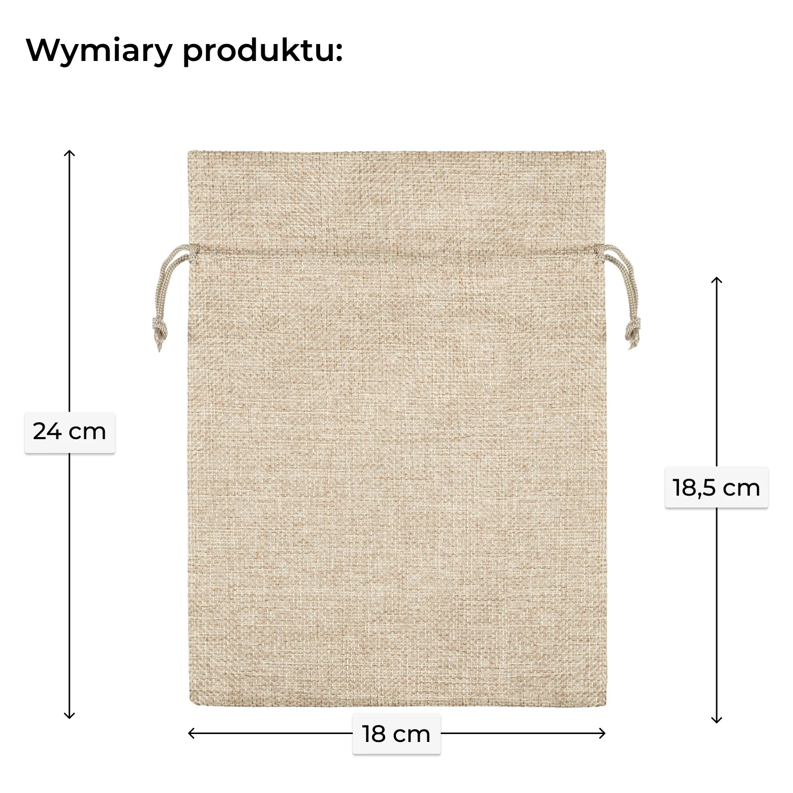 Uniwersalne woreczki z eleganckiej juty w kolorze naturalnym w rozmiarze 18 cm x 24 cm. Prezentowany pakiet składa się z 5 sztuk, dzięki czemu jednorazowy zakup może wystarczyć na dłuższy czas.