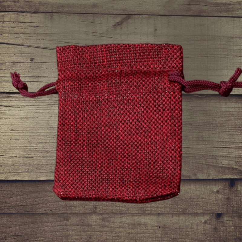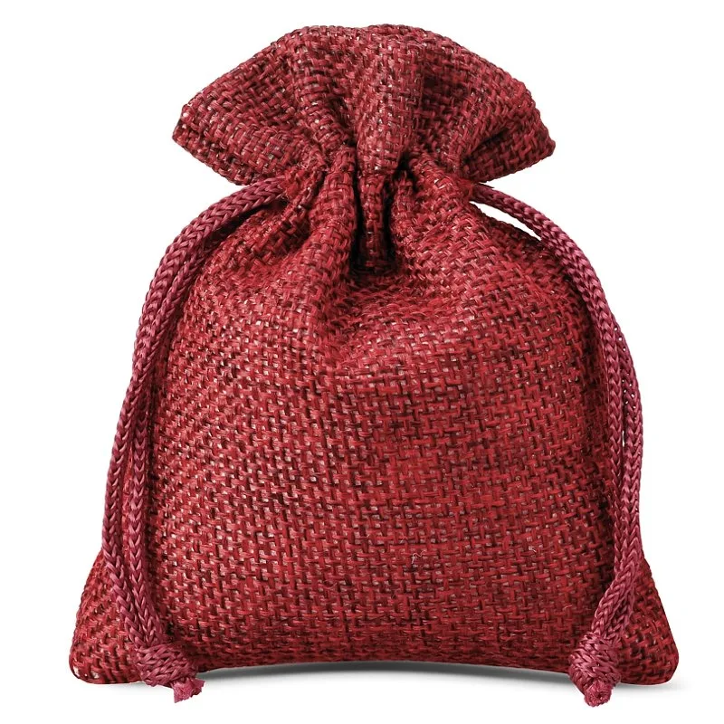 10 sztuk woreczków jutowych w kolorze bordowym w rozmiarze 8 cm x 10 cm.