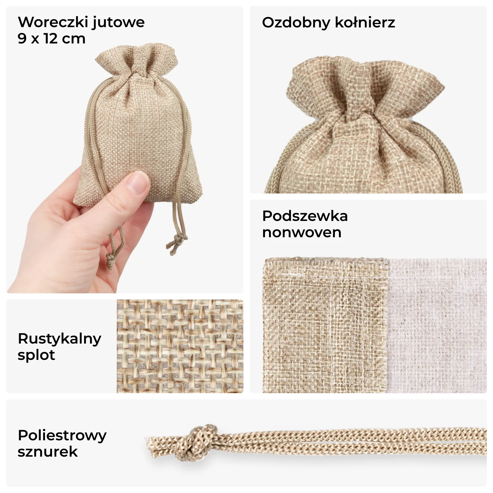 Niewielkie, bardzo uniwersalne woreczki z eleganckiej juty w kolorze naturalnym w rozmiarze 9 cm x 12 cm. Prezentowany pakiet składa się z 10 sztuk, dzięki czemu jednorazowy zakup może wystarczyć na dłuższy czas.