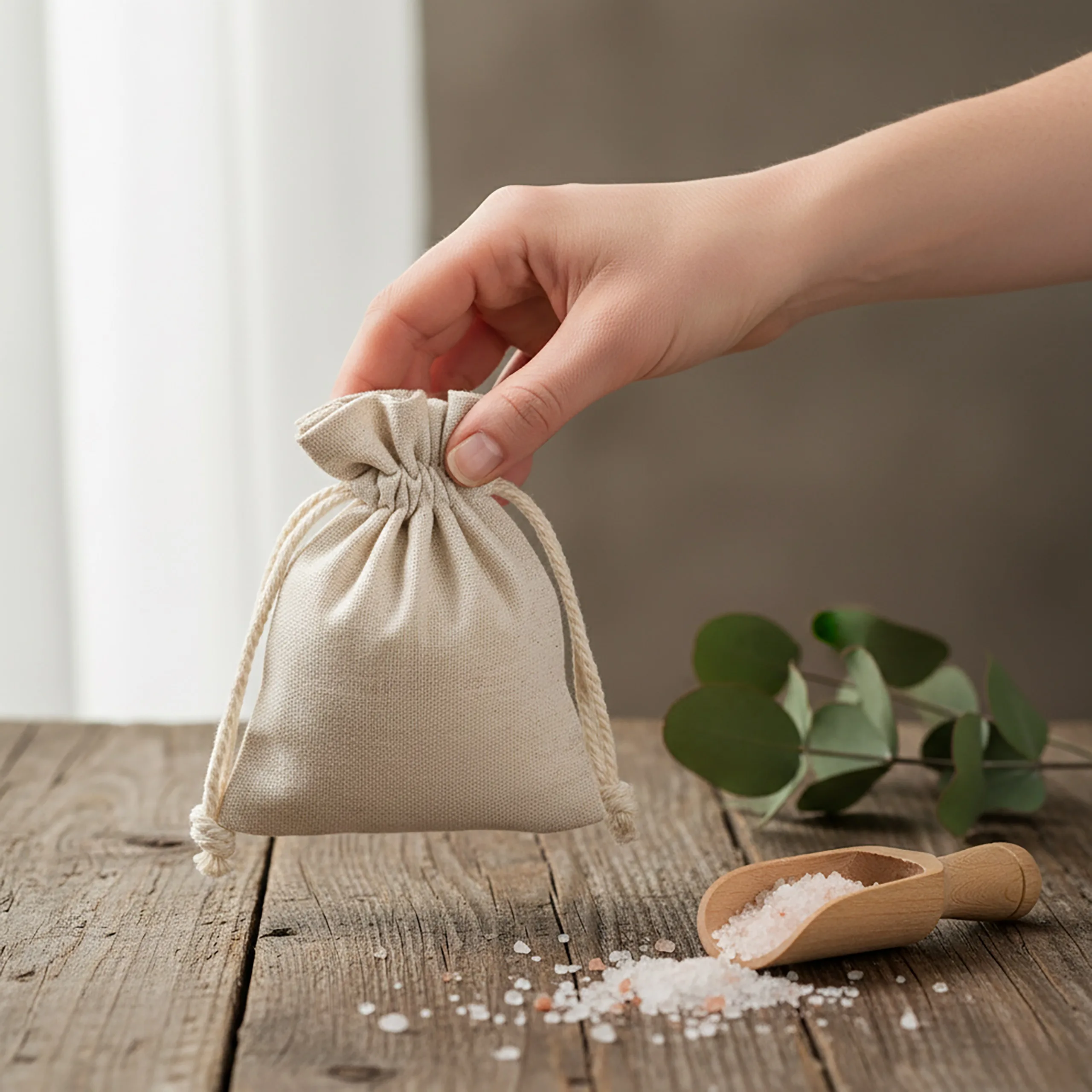 Woreczki uszyto z tkaniny à la len, czyli mieszanki bawełny i poliestru odwzorowującej naturalny splot lnianego płótna. Struktura materiału nadaje im wygląd zbliżony do lnu, a jednocześnie zapewnia większą odporność na zagniecenia i codzienne użytkowanie. Naturalny, beżowy kolor pasuje do stylu boho, rustykalnego i minimalistycznego, dzięki czemu woreczki à la lniane dobrze komponują się z rękodziełem, kosmetykami i prezentami. Podwójny, bawełniany sznurek umożliwia szybkie zamknięcie i wielokrotne wygodne korzystanie z sakiewki.