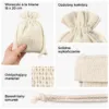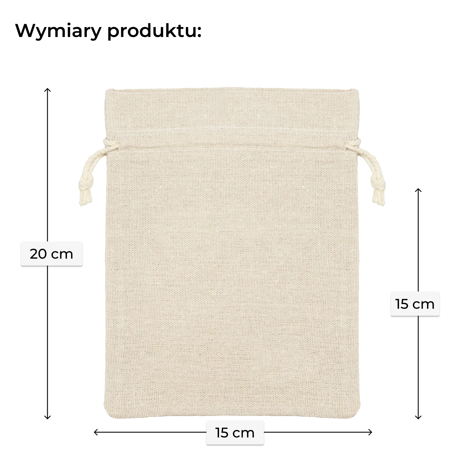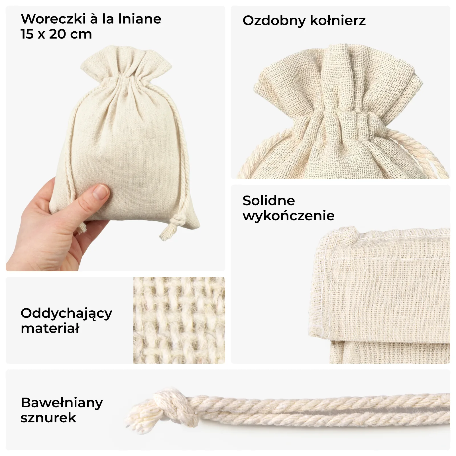 Woreczki powstają z tkaniny à la len, czyli mieszanki bawełny i poliestru, która odwzorowuje wygląd naturalnego płótna lnianego. Materiał jest przewiewny, przyjemny w dotyku i bardziej odporny na zagniecenia niż klasyczny len. Surowa faktura oraz naturalny beżowy kolor sprawiają, że woreczki wpisują się w stylistykę boho, rustykalną, zero waste i minimalistyczną. Podwójny bawełniany sznurek umożliwia szybkie zamykanie i wygodne, wielokrotne użytkowanie, co czyni z nich trwałą alternatywę dla jednorazowych opakowań.