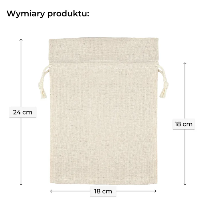 Woreczki wykonane są z tkaniny à la len, czyli mieszanki bawełny i poliestru odwzorowującej wygląd naturalnego płótna. Materiał jest przewiewny, przyjemny w dotyku i bardziej odporny na zagniecenia niż klasyczny len. Surowa faktura oraz beżowy kolor sprawiają, że woreczki pasują do stylistyki boho, rustykalnej, less waste i minimalistycznej. Podwójny bawełniany sznurek umożliwia szybkie zamykanie i wygodne, wielokrotne użytkowanie, co czyni je trwałą alternatywą dla jednorazowych opakowań.