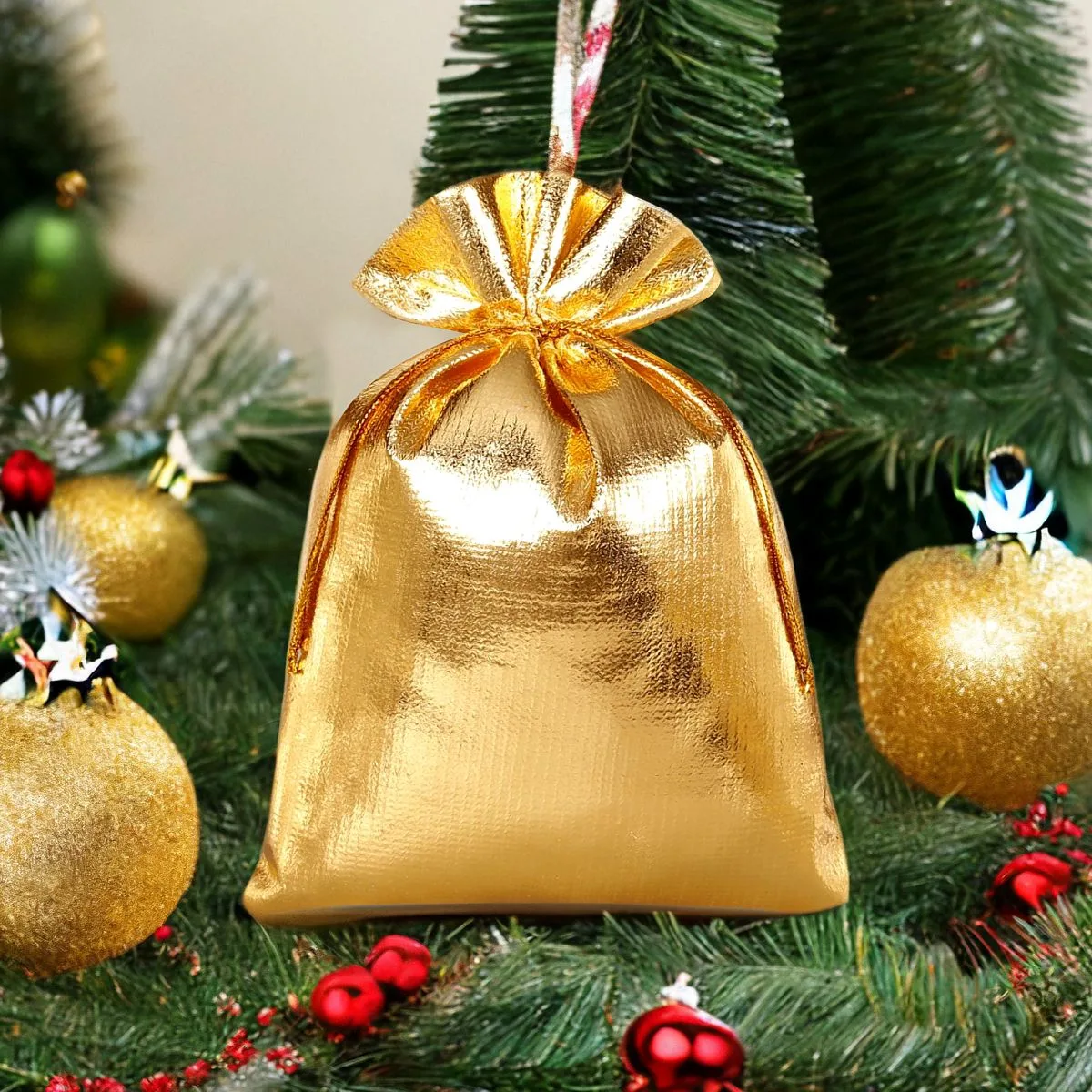 Zestaw 10 sztuk metalicznych woreczków o wymiarach 13 cm x 18 cm w kolorze złotym.